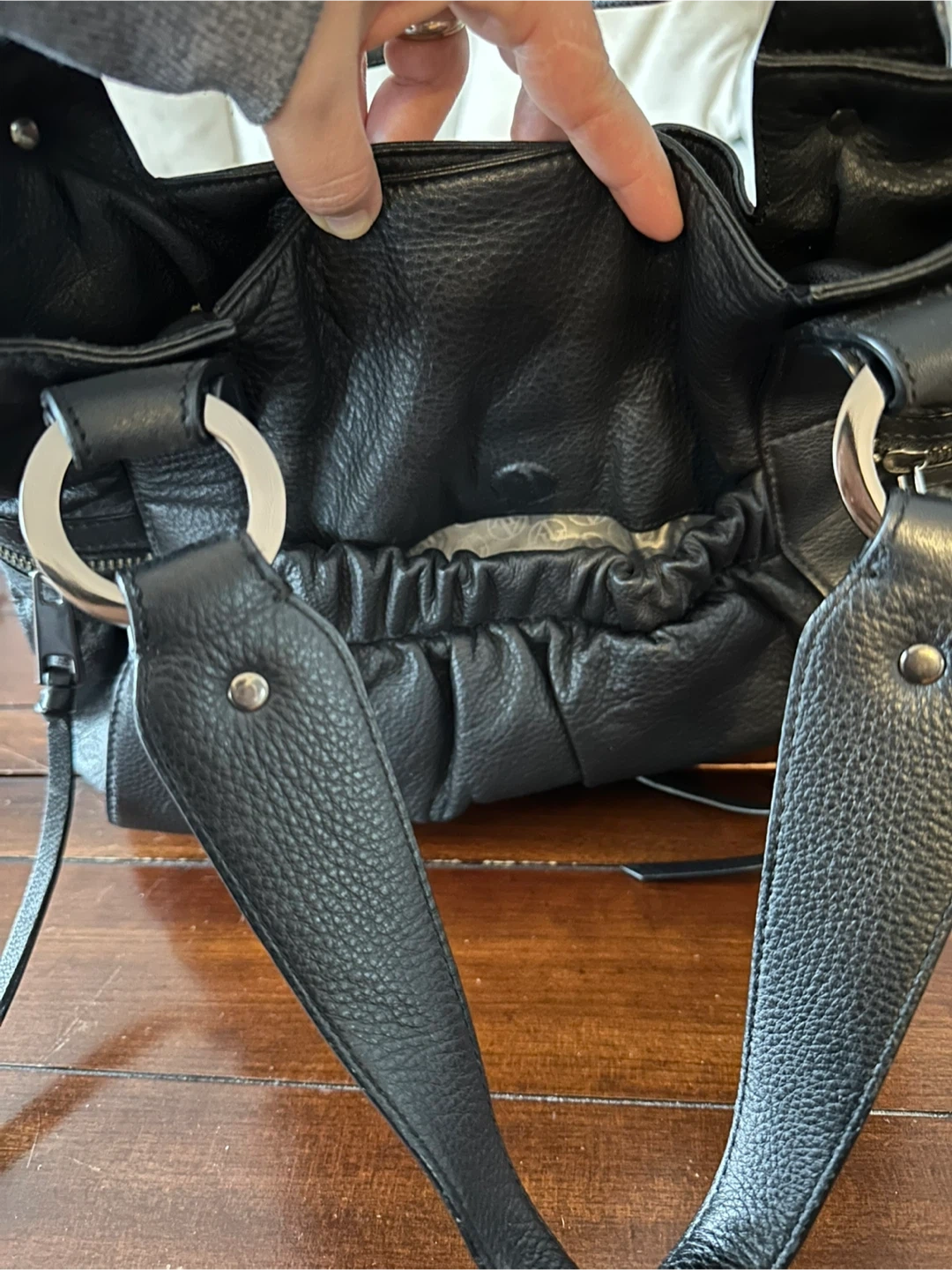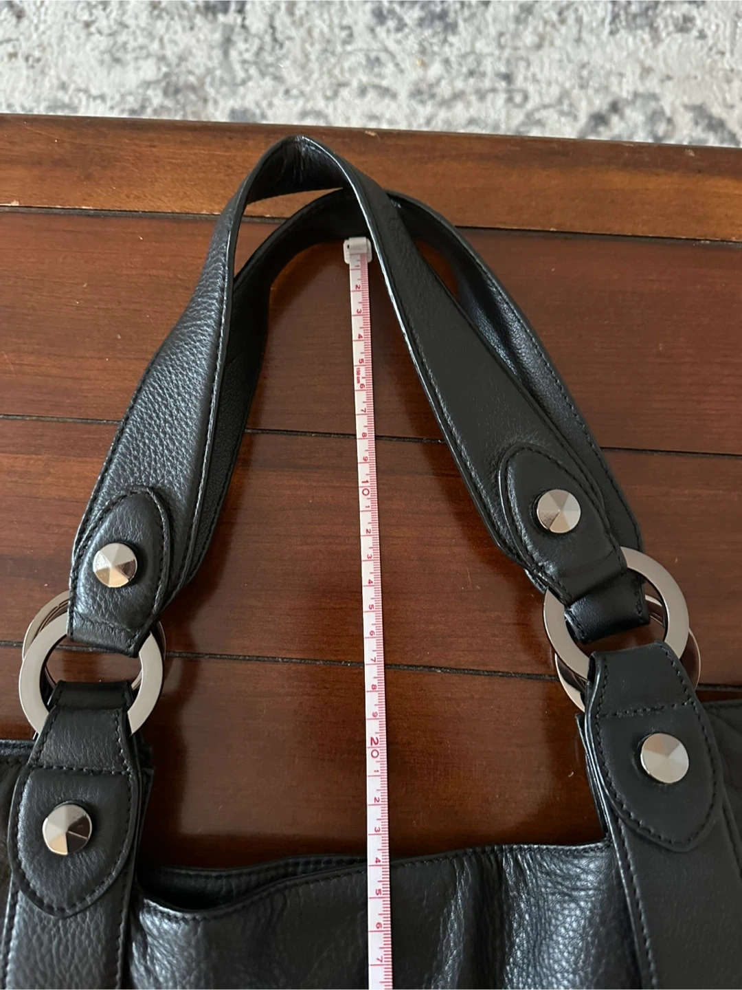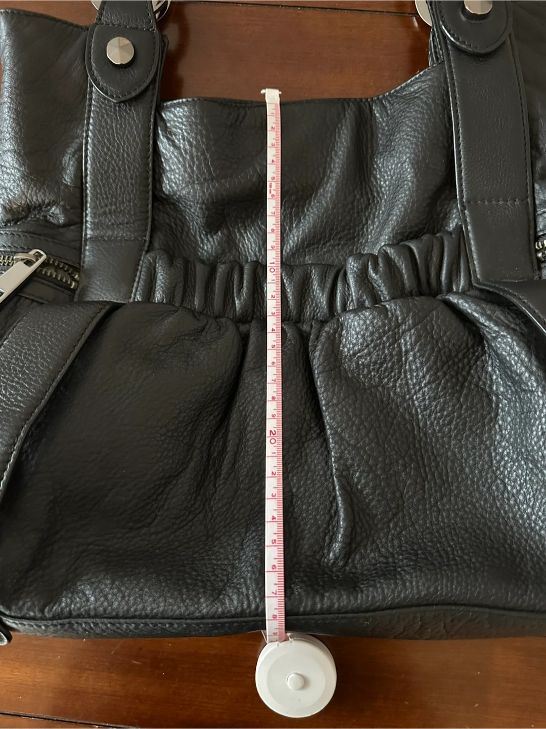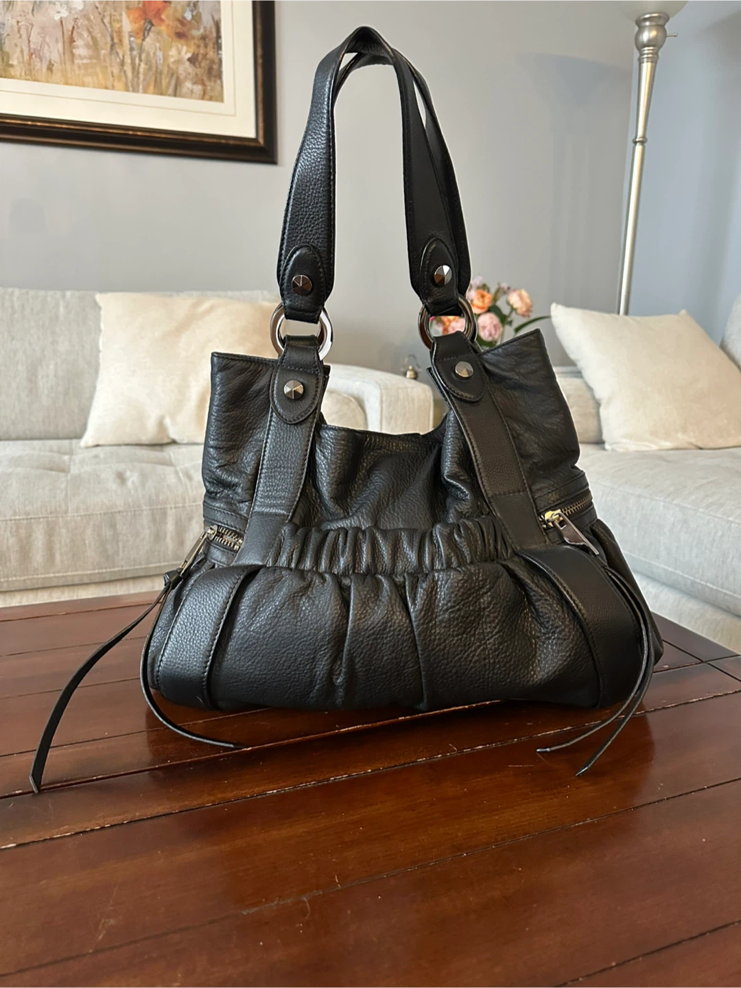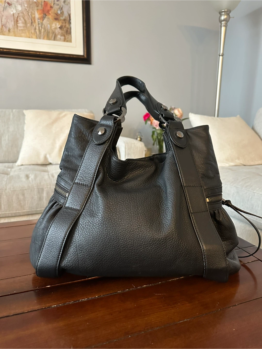 This is a beautiful Adrienne Vittadini black leather satchel. It's in new condition and the perfect size for everyday use. The bag measures approximately 30cm in length. It has a zipper closure and silver-tone hardware. The interior is lined with a patterned fabric and includes a zippered pocket. Pickup CITADEL NW