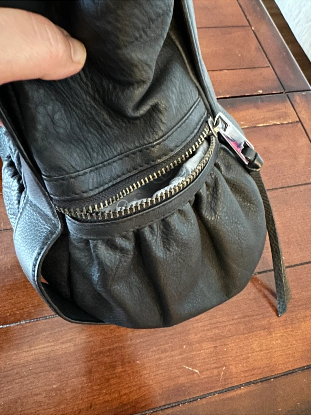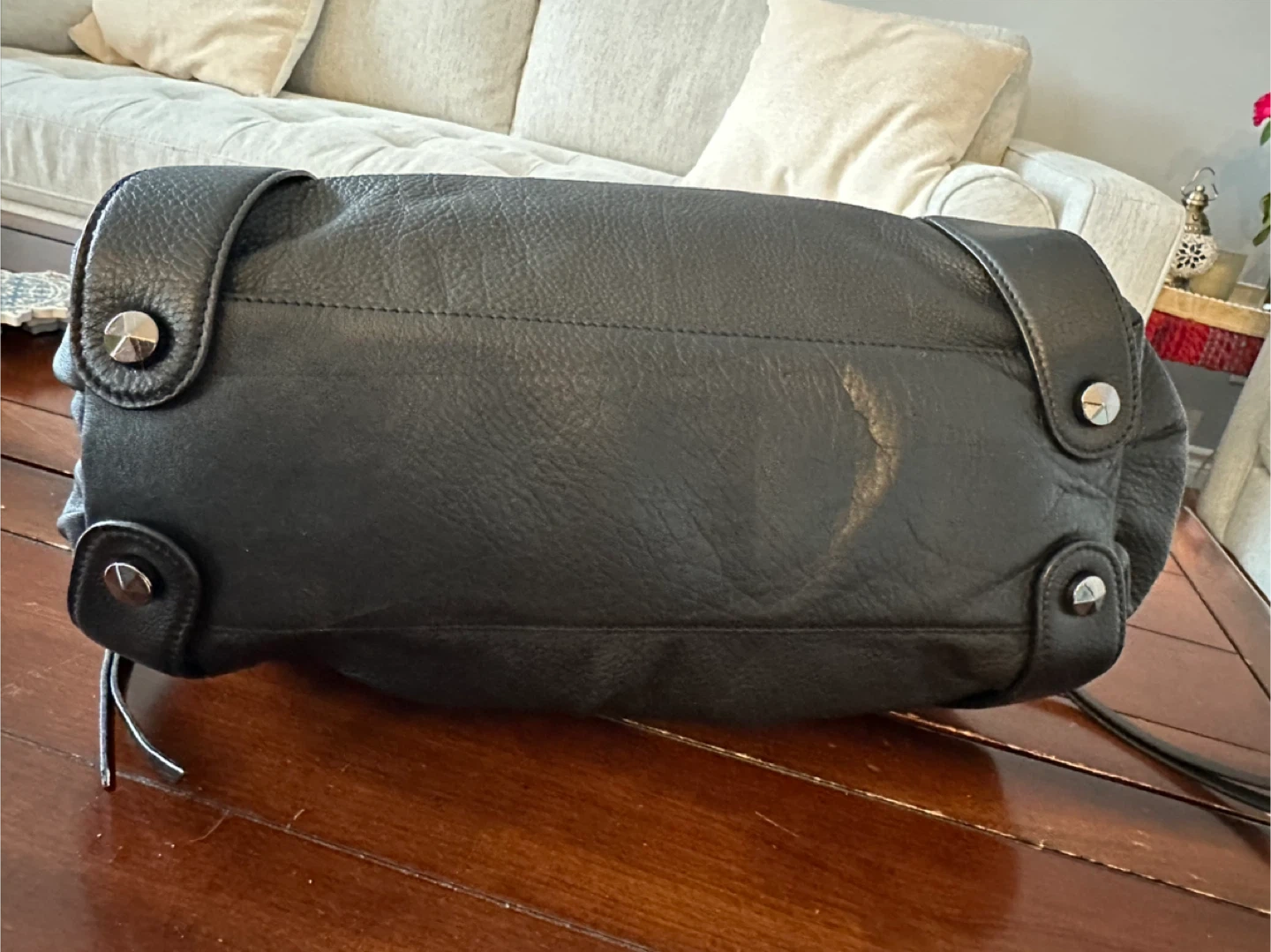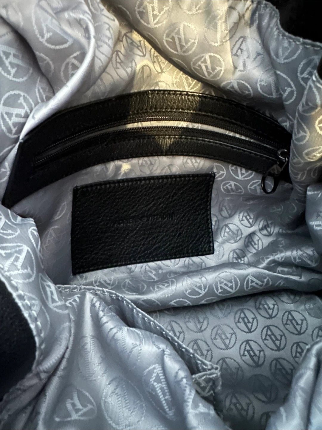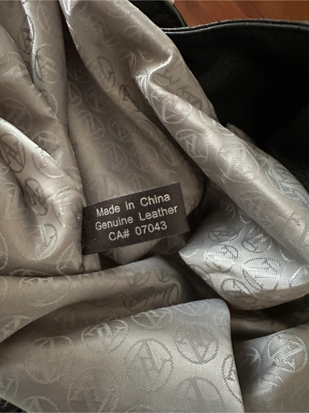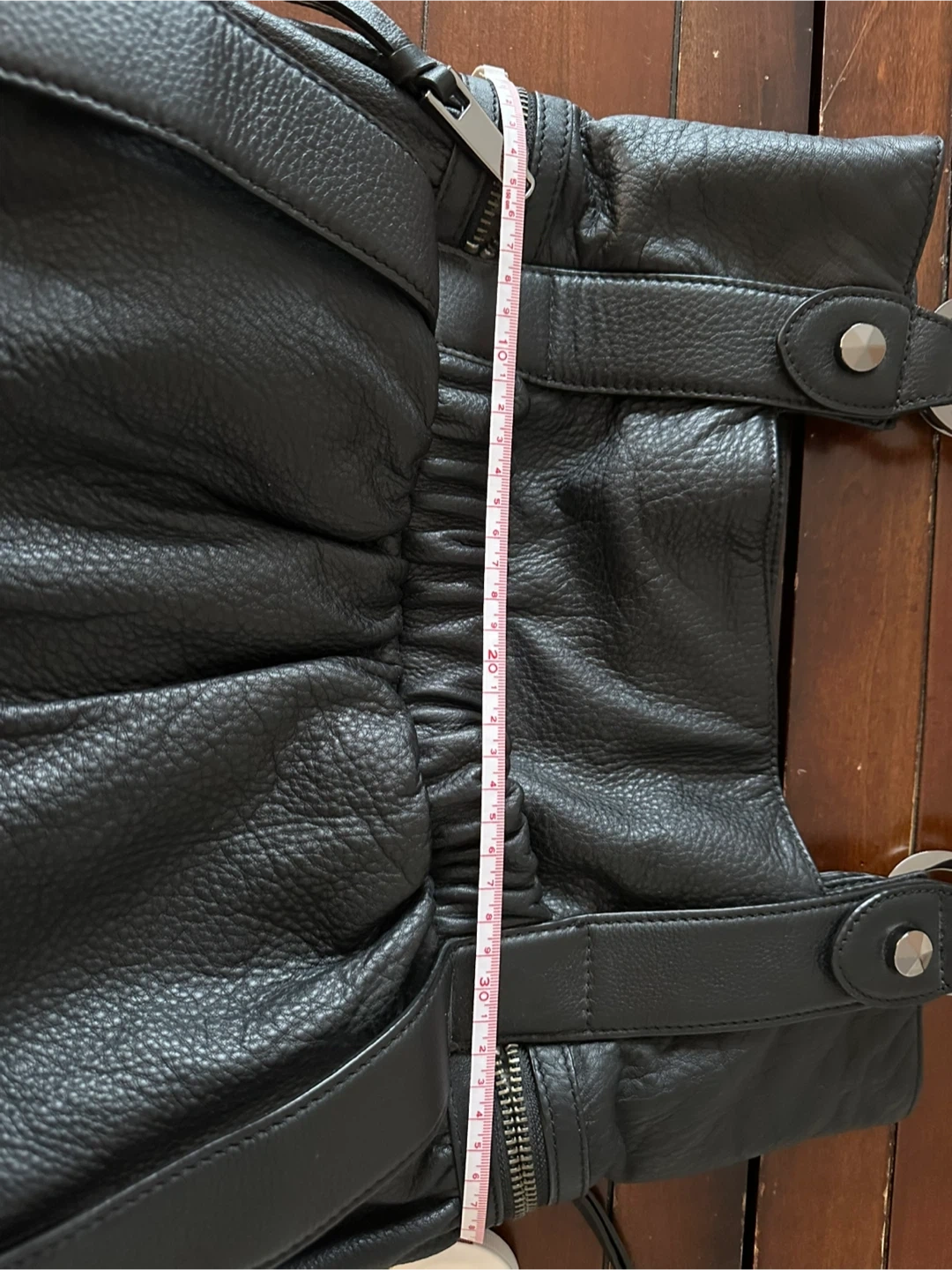 This is a beautiful Adrienne Vittadini black leather satchel. It's in new condition and the perfect size for everyday use. The bag measures approximately 30cm in length. It has a zipper closure and silver-tone hardware. The interior is lined with a patterned fabric and includes a zippered pocket. Pickup CITADEL NW