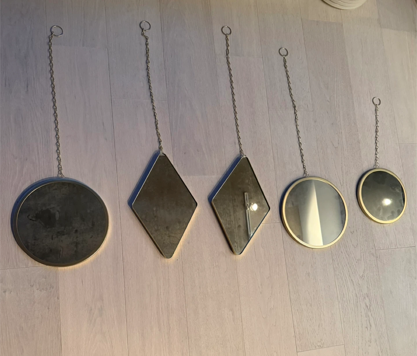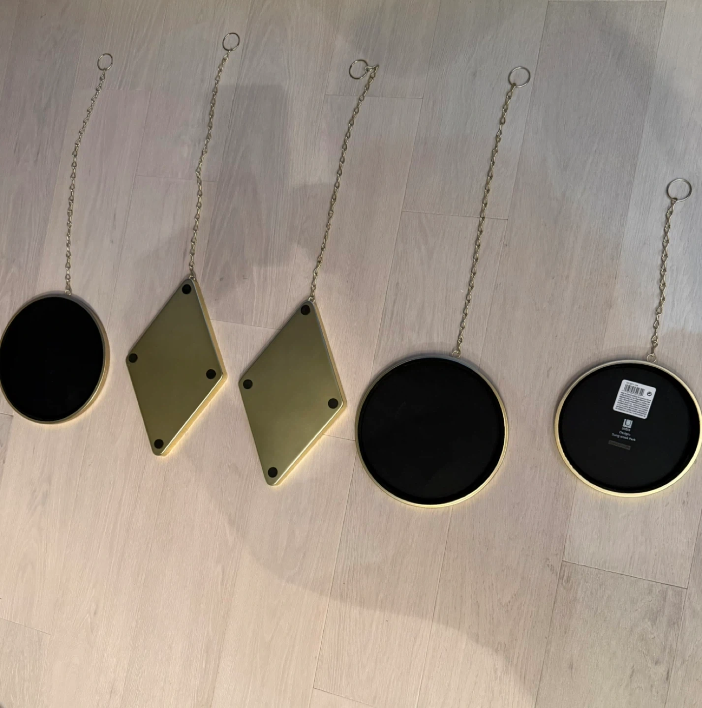 Set of 5 Umbra Dima decorative hanging mirrors. They're in great condition and ready to add a stylish touch to your space! The set includes a variety of shapes and sizes, all with a sleek gold finish. Perfect for creating a unique wall display or adding a touch of glam to any room. Second picture shows the back of mirrors.