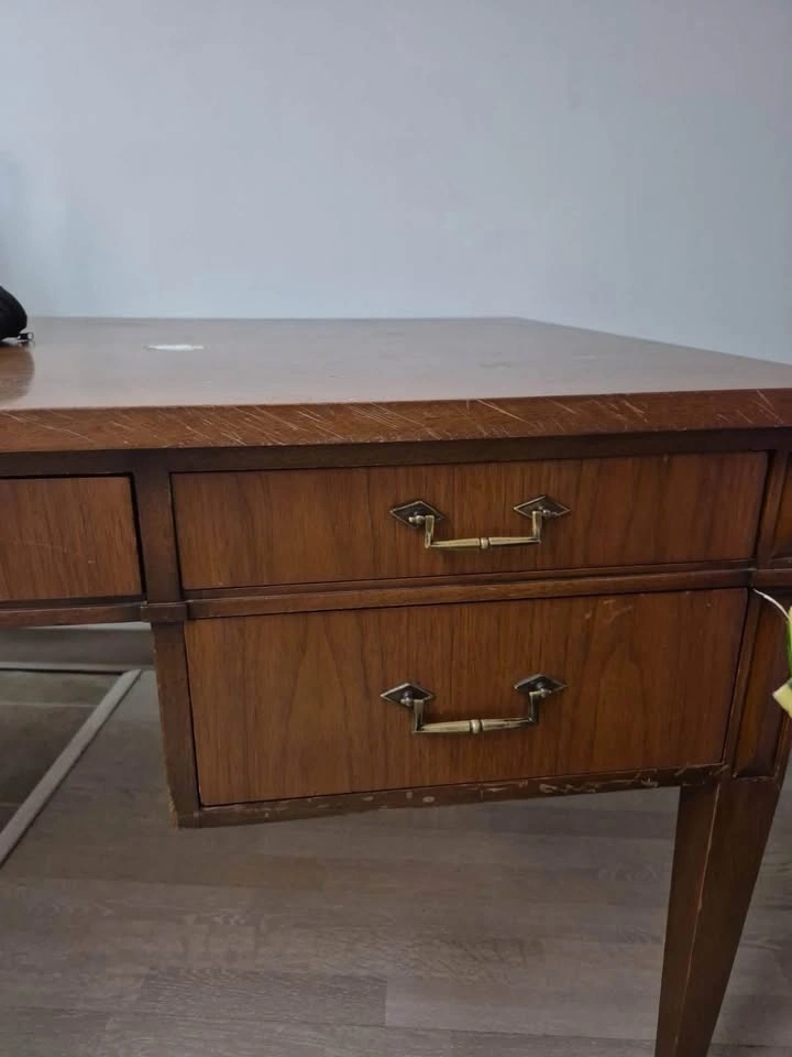Stunning mid-century wooden desk with original hardware and clean, classic lines. Solid and sturdy with generous drawer storage. Perfect for a home office, studio, or creative workspace. Light vintage wear consistent with age. Some light refinishing would benefit the piece, but it's stunning. One handle needs replacing.