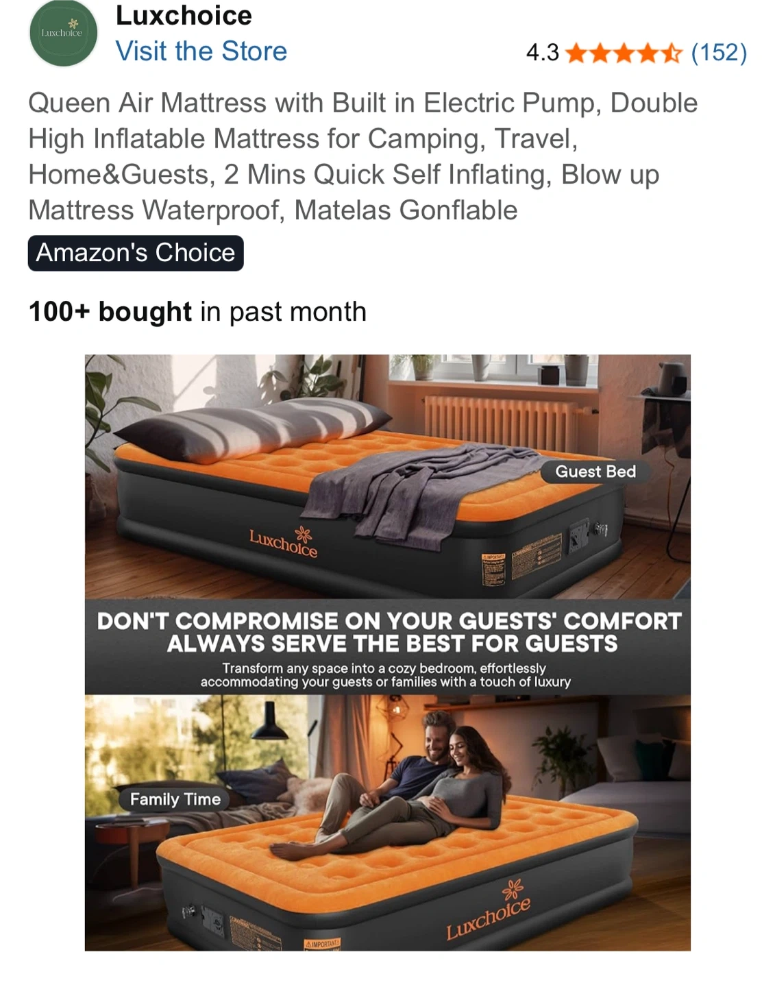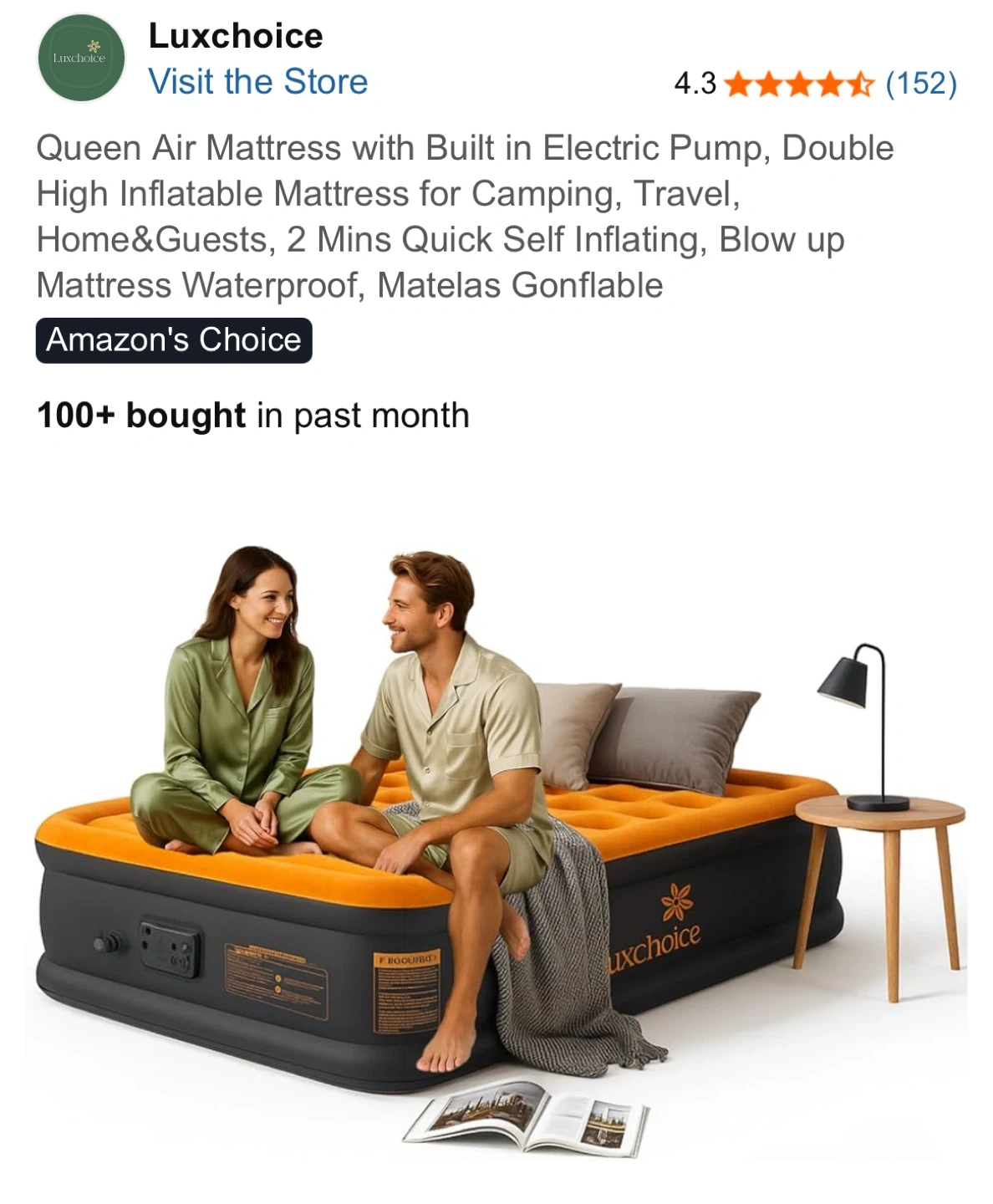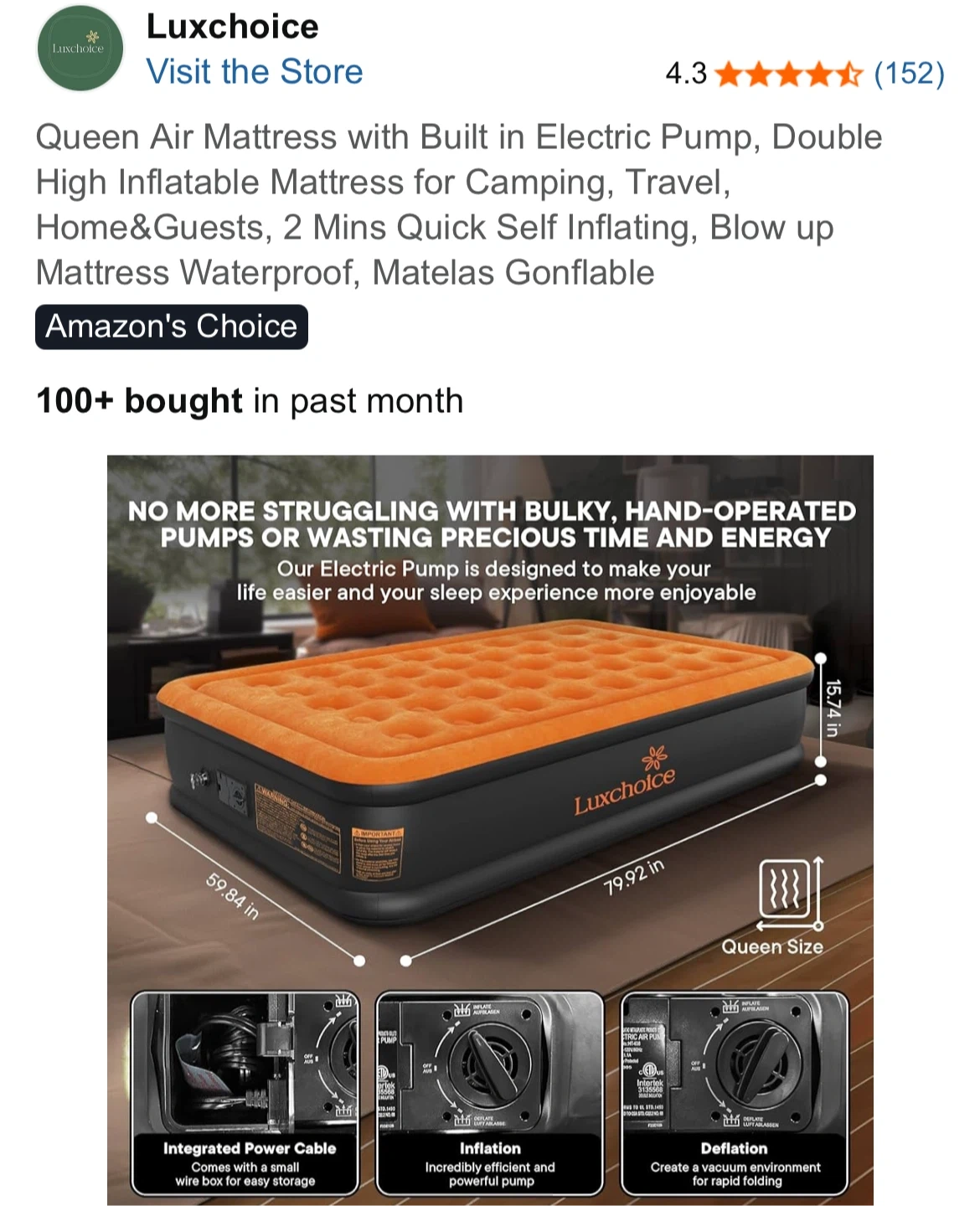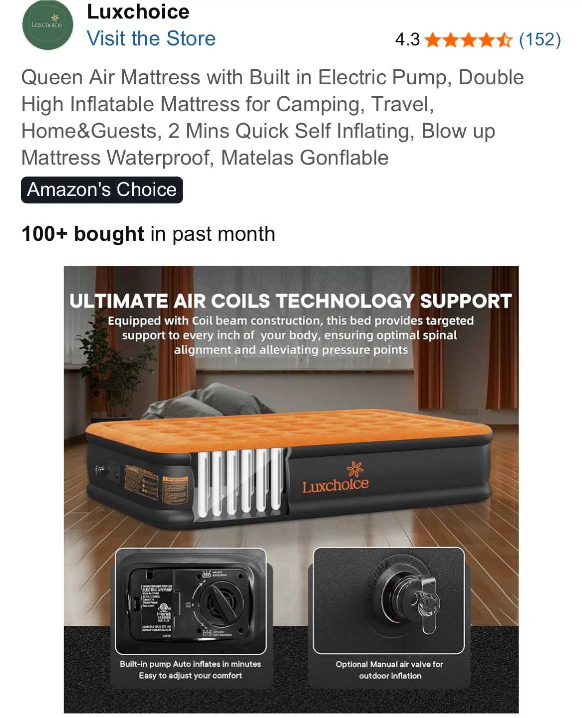 Selling a Luxchoice Queen Air Mattress. It's in like new condition! This double high inflatable mattress is perfect for camping, travel, or guests. It has a built-in electric pump for quick self-inflating in just 2 minutes. It's also waterproof and offers enhanced spinal support with its coil beam construction. You'll wake up refreshed and ready to take on the day with its ultra soft flock top layer and safety edge heightened design