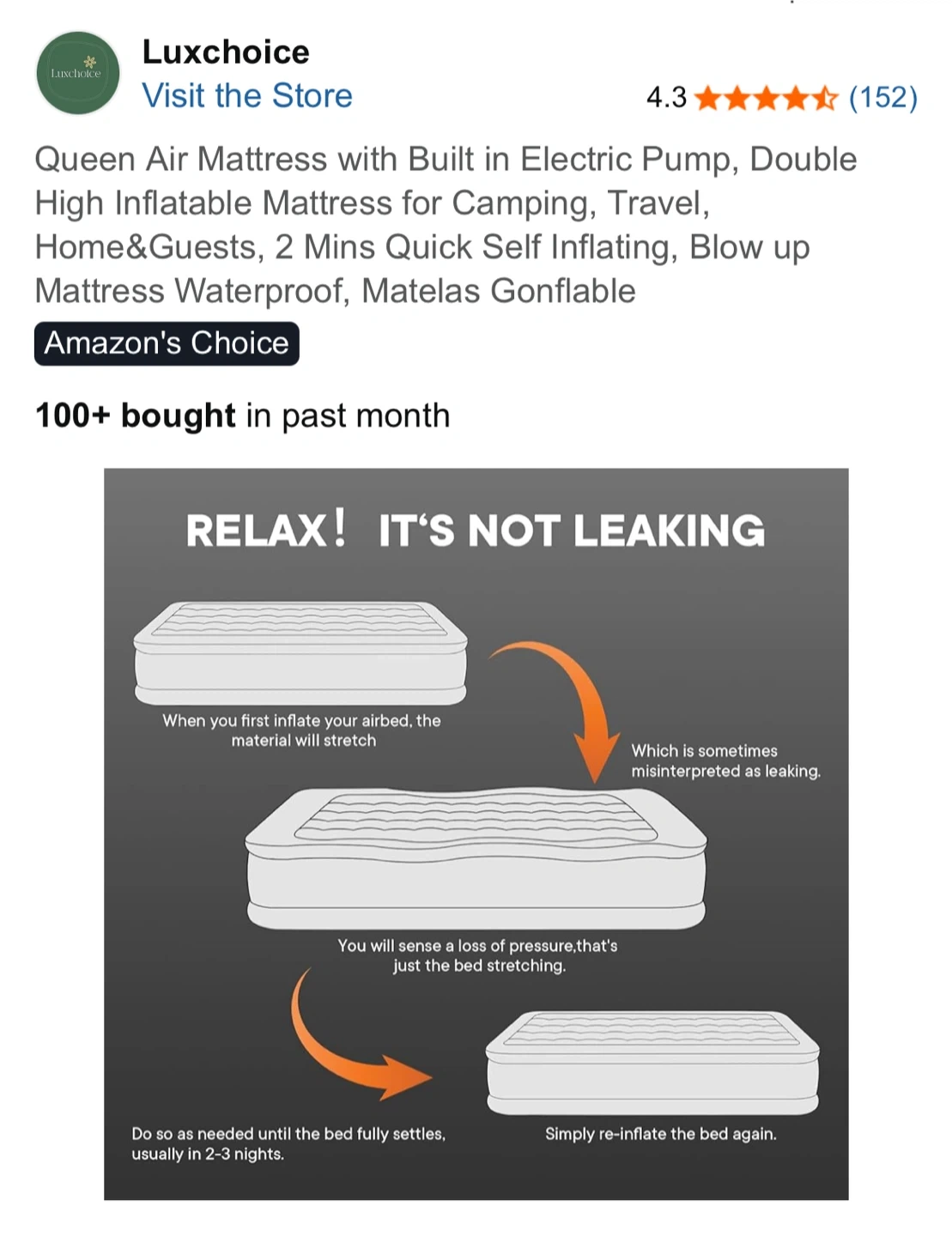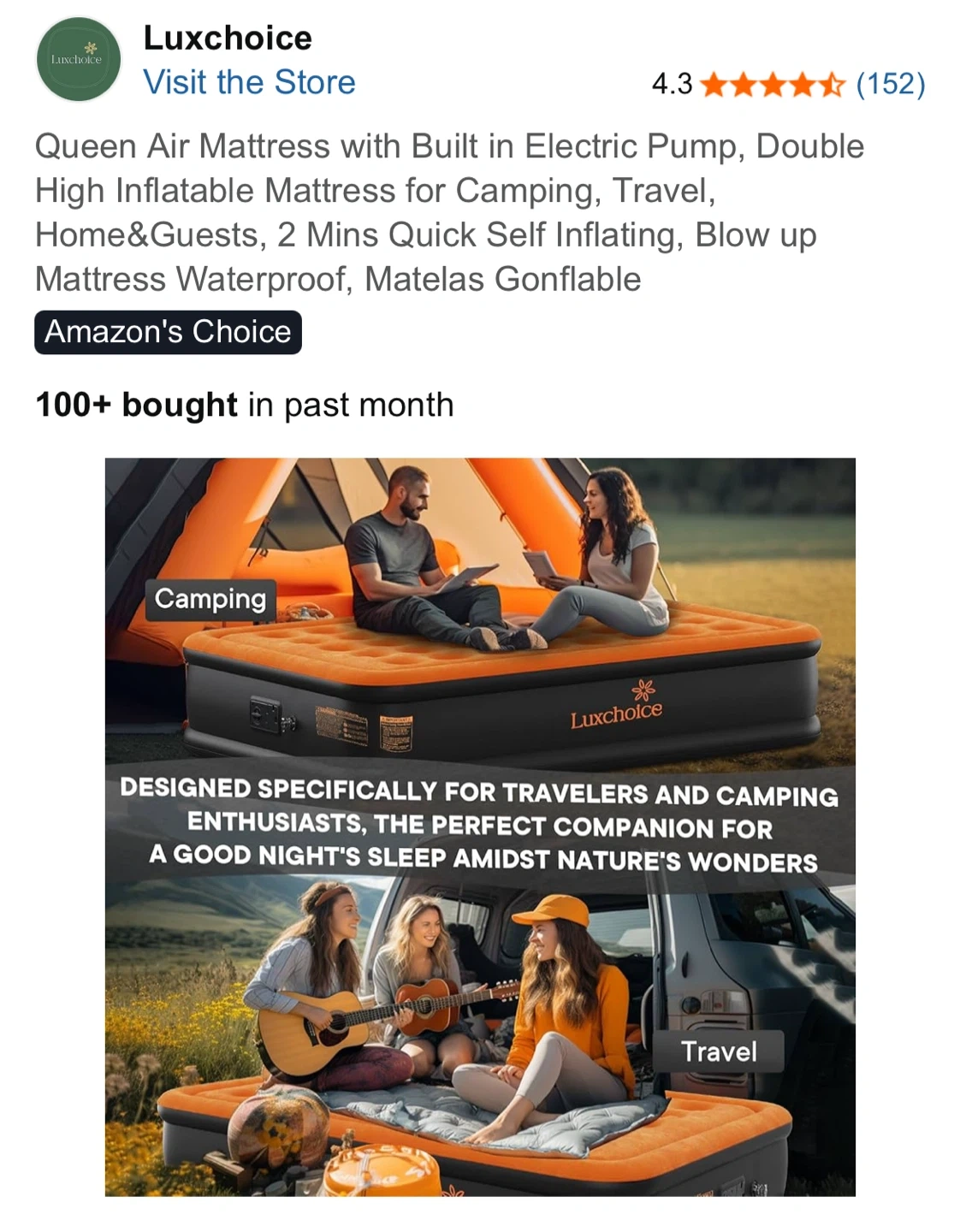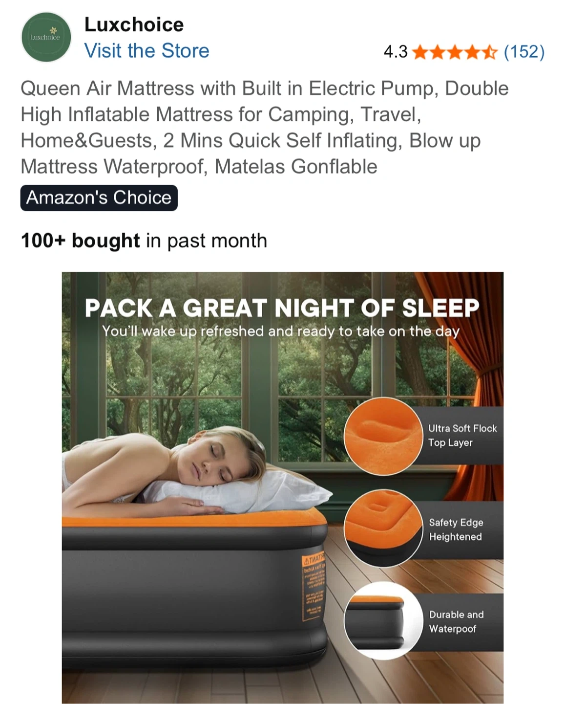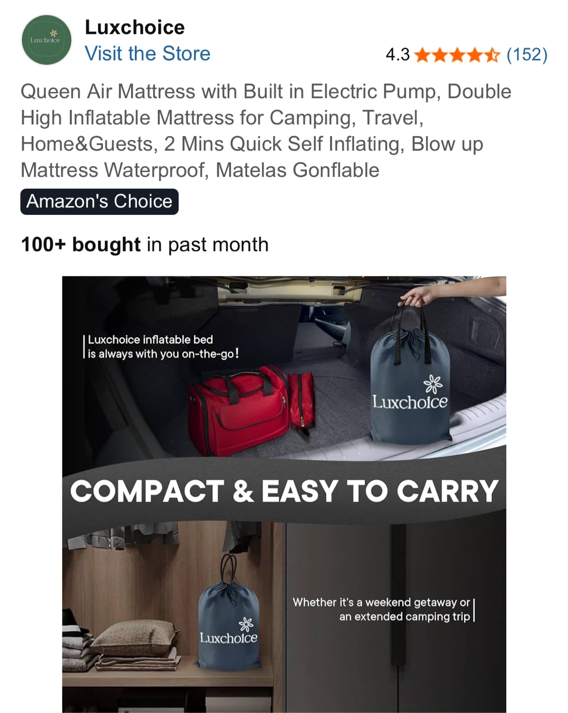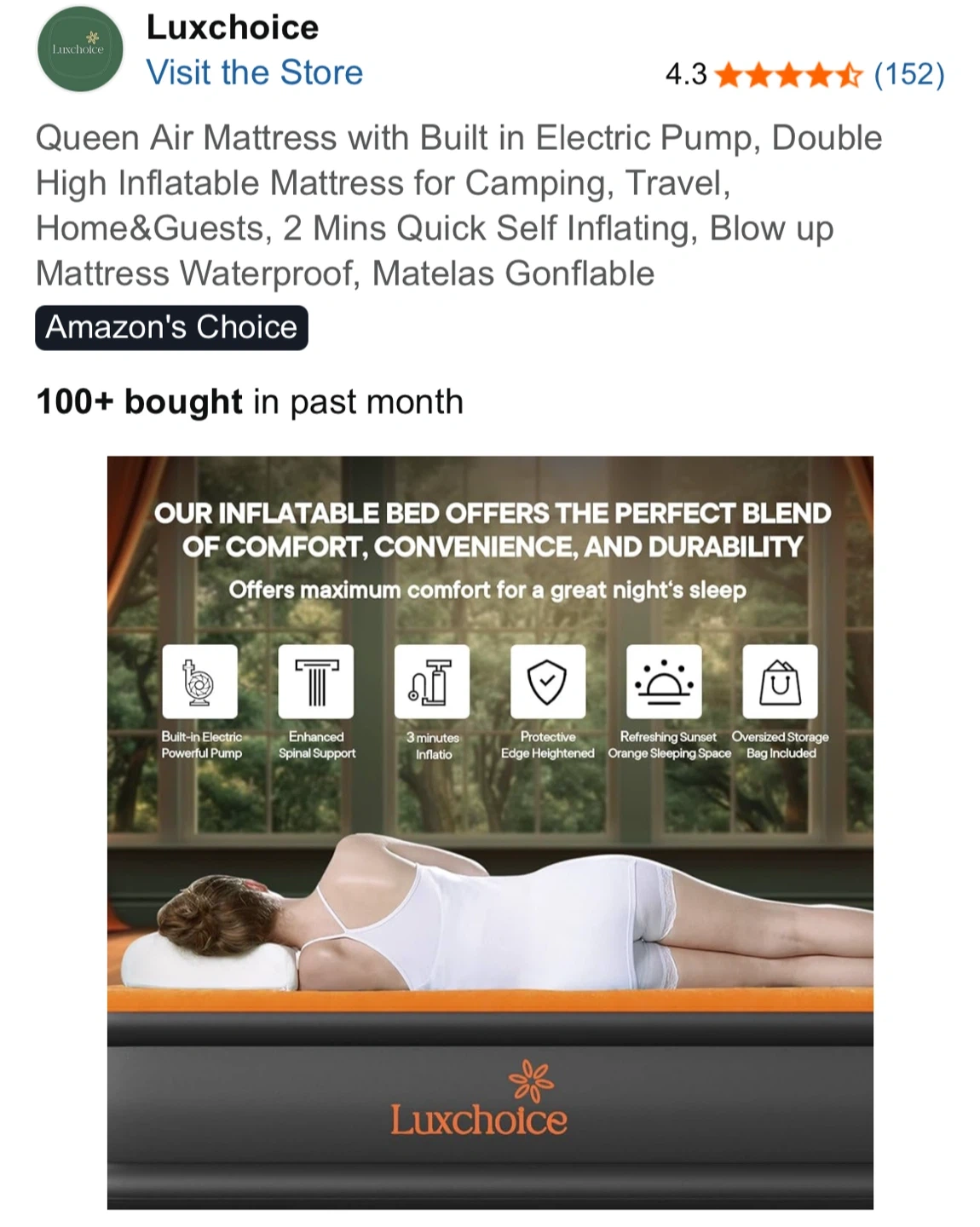 Selling a Luxchoice Queen Air Mattress. It's in like new condition! This double high inflatable mattress is perfect for camping, travel, or guests. It has a built-in electric pump for quick self-inflating in just 2 minutes. It's also waterproof and offers enhanced spinal support with its coil beam construction. You'll wake up refreshed and ready to take on the day with its ultra soft flock top layer and safety edge heightened design