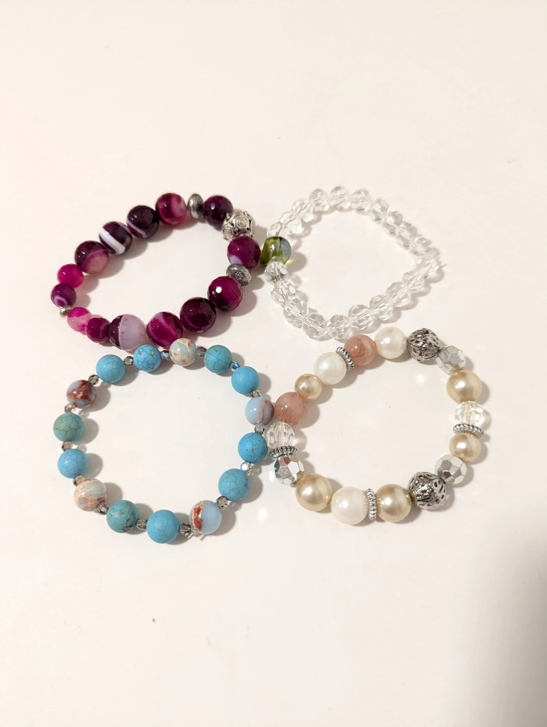 Selling a set of four handmade beaded bracelets. They feature a variety of colours and bead types, including pink, purple, turquoise, clear, and pearl-like beads. A fun addition to any outfit!