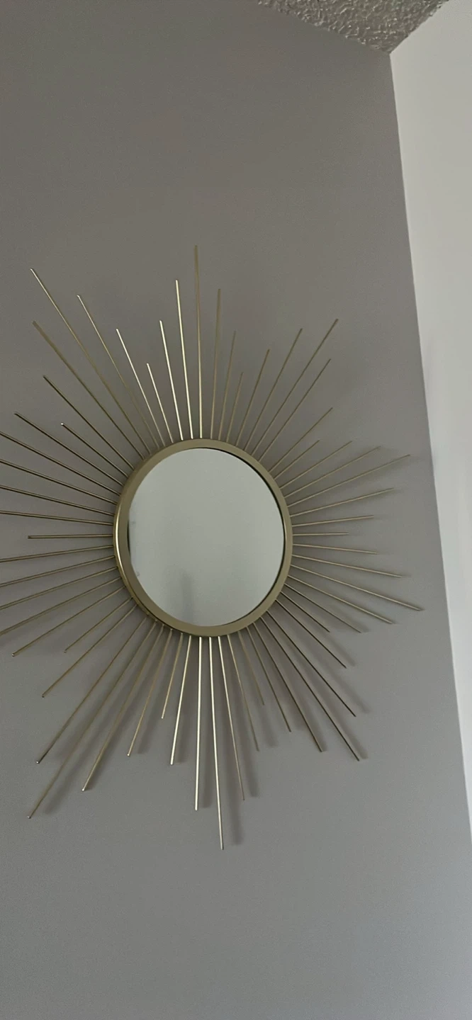 Selling a stylish gold sunburst mirror! It's in great condition and would add a lovely touch to any room. The mirror has a unique design with radiating gold spokes, making it a real statement piece