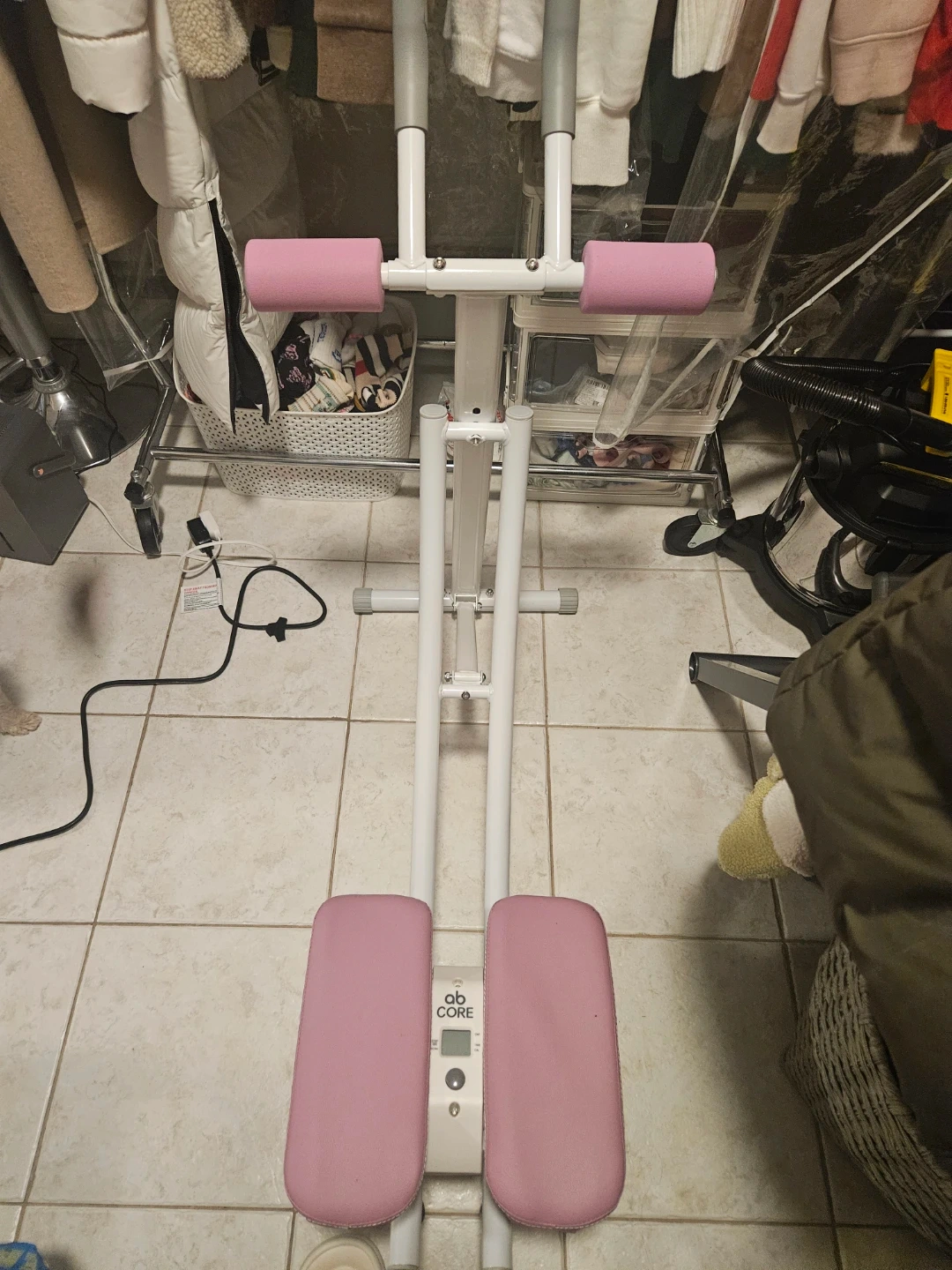 Selling an AB Core abdominal trainer in good condition! It features pink pads and a white frame. Perfect for working out your core at home
