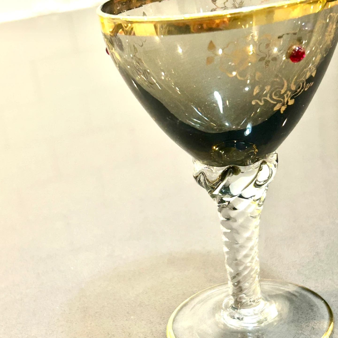 The goblet is artisan made, not factory pressed. Visible pontil scar on the base and interior rotation marks clearly indicate hand-blown construction. The twisted clear stem and weighted foot add both visual balance and quality feel, consistent with Bohemian export glass produced for the international market.