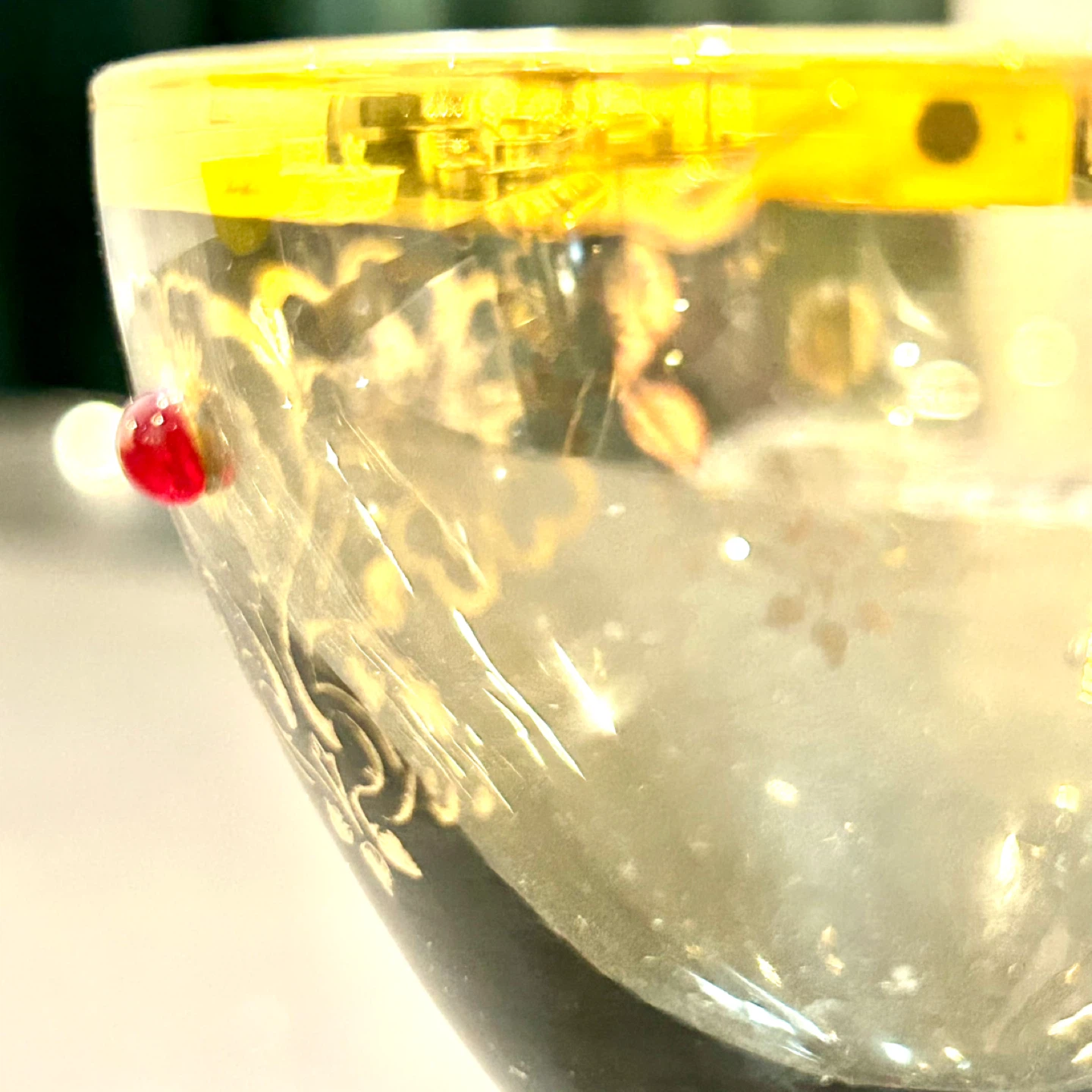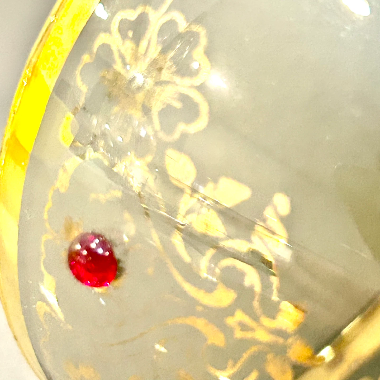 • Features: Gold rim, enamel floral design, applied ruby glass jewels