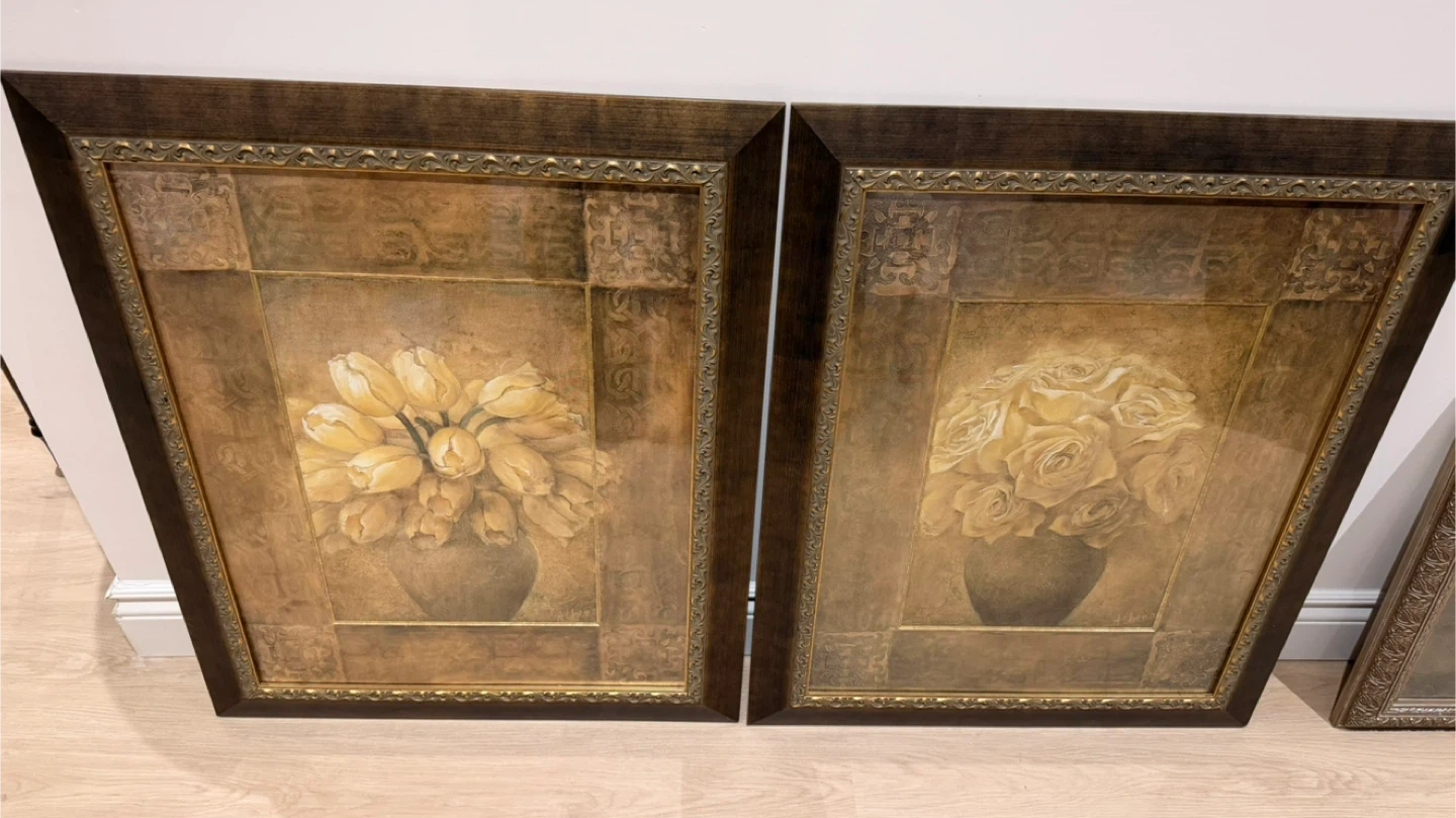 Selling a set of two framed floral wall art pieces. They feature a brown and gold-toned frame with a floral design. One has tulips and the other has roses!