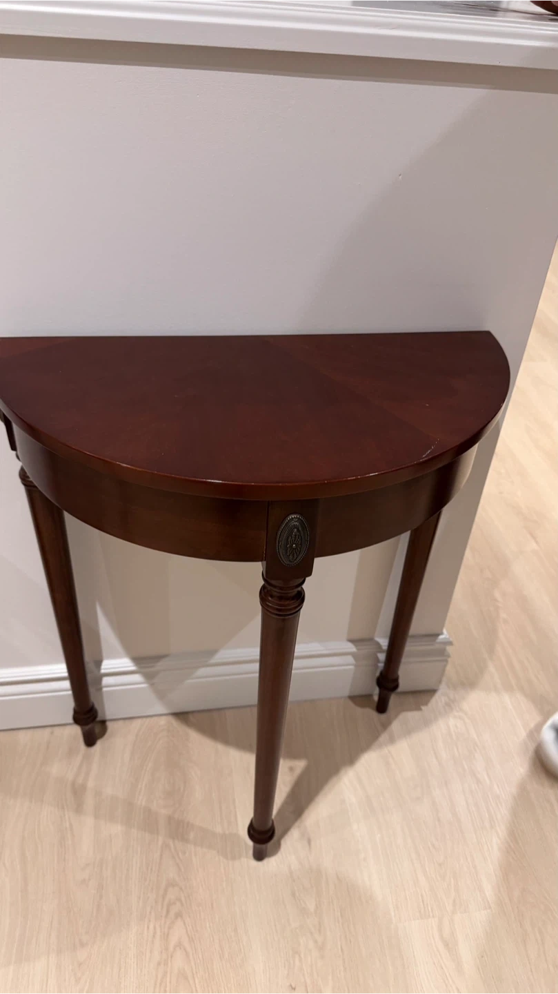 Selling a dark red half-moon console table! It's perfect for entryways or small spaces. The table has a classic design with elegant, slender legs. It's in great condition and ready to add a touch of sophistication to your home