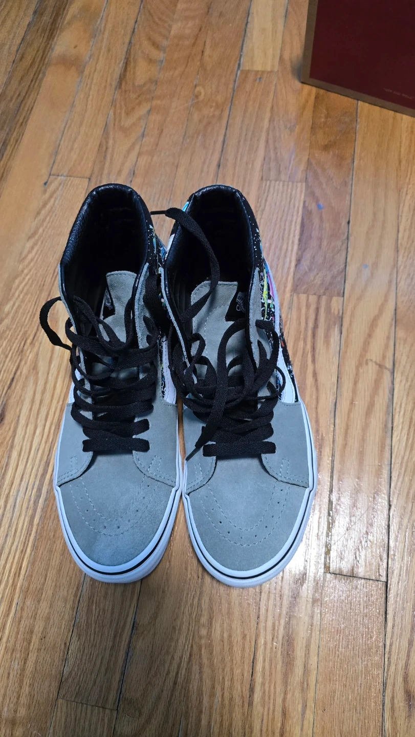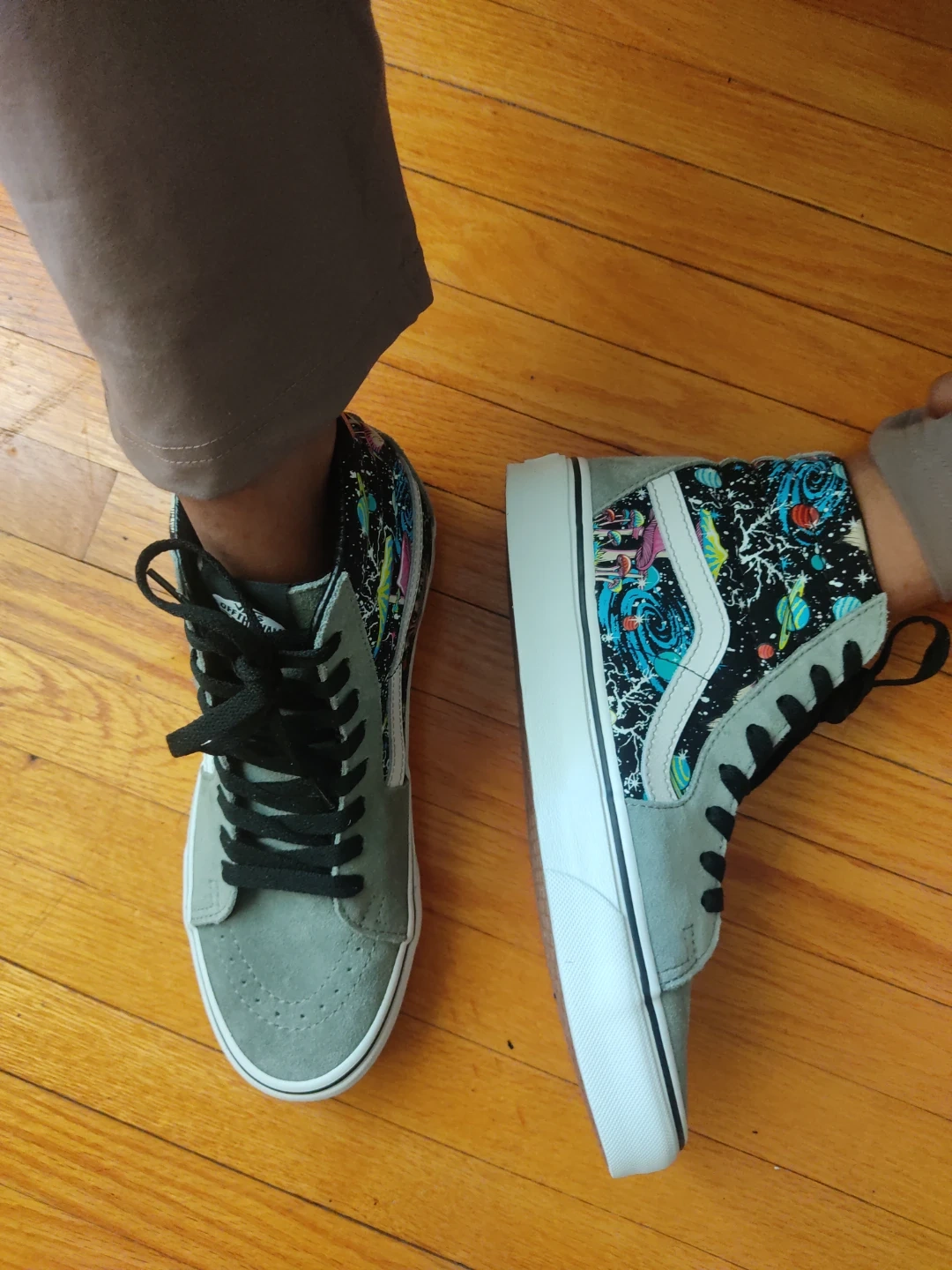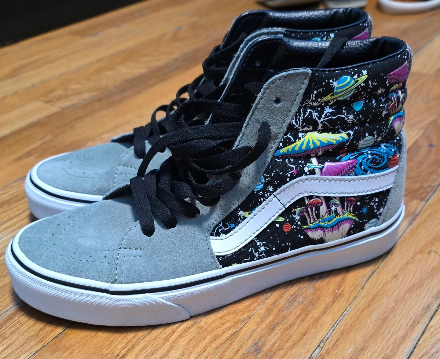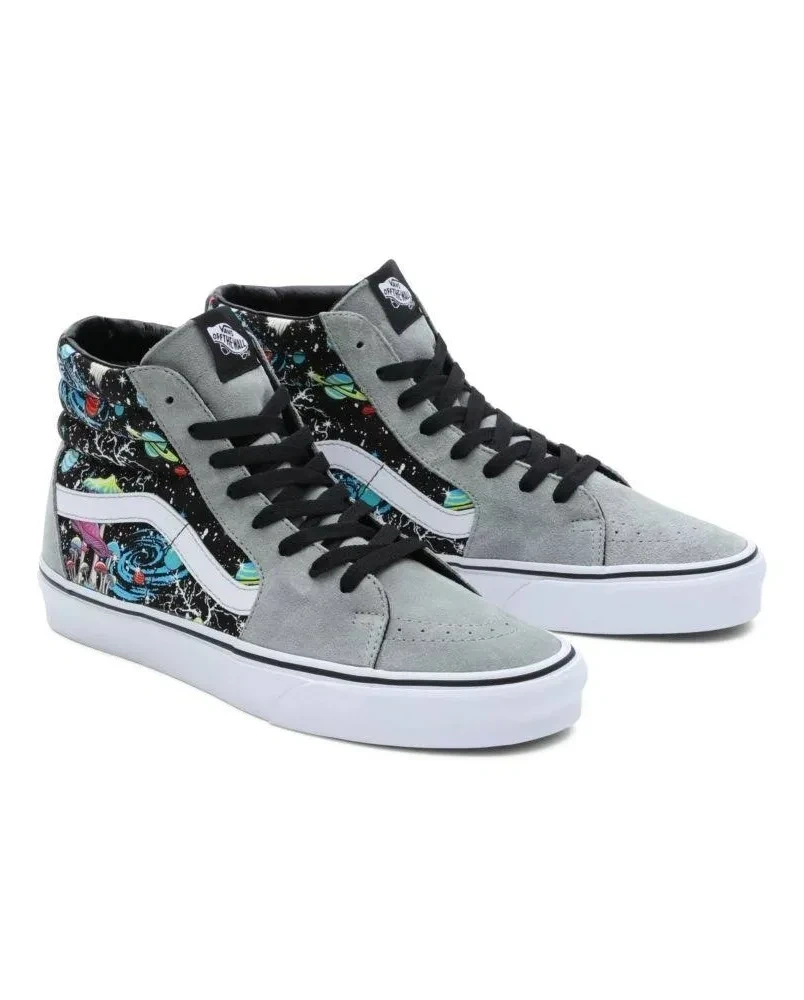 Selling a pair of Vans Sk8-Hi high-top sneakers with a cool cosmic and space design! They're in great shape and ready for a new adventure. The colour is grey and black with a white sole.