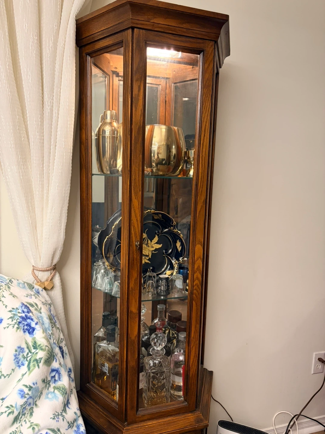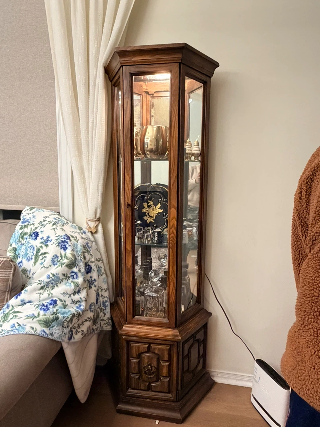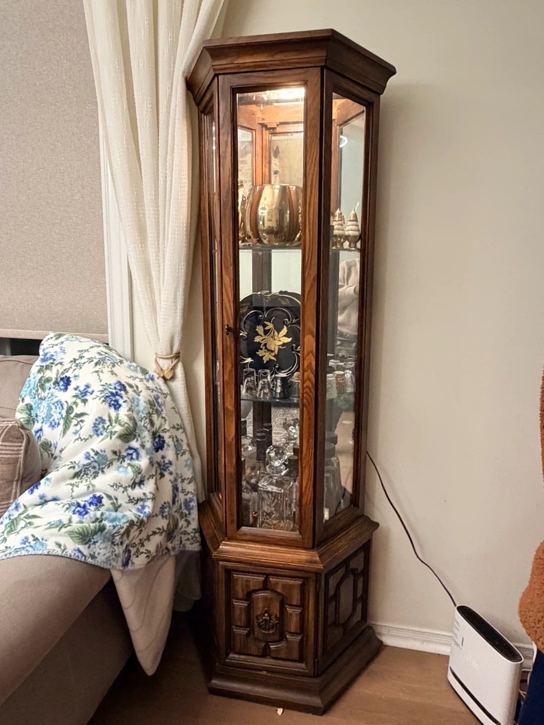 Selling a lovely wooden corner curio cabinet! It's perfect for displaying your favourite items and adding a touch of elegance to any room. The cabinet is in great shape and features glass shelves and a built-in light to showcase your collectibles.