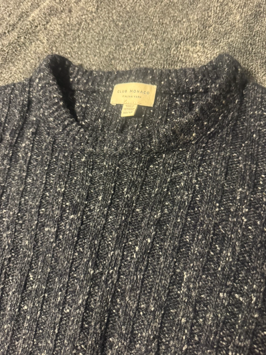 Club Monaco sweater in size XS/TP. It's made with Italian yarn and is a blend of wool, nylon, and viscose. Perfect for staying cozy!