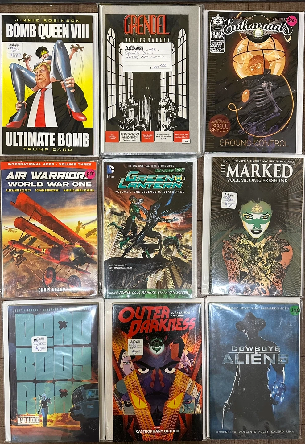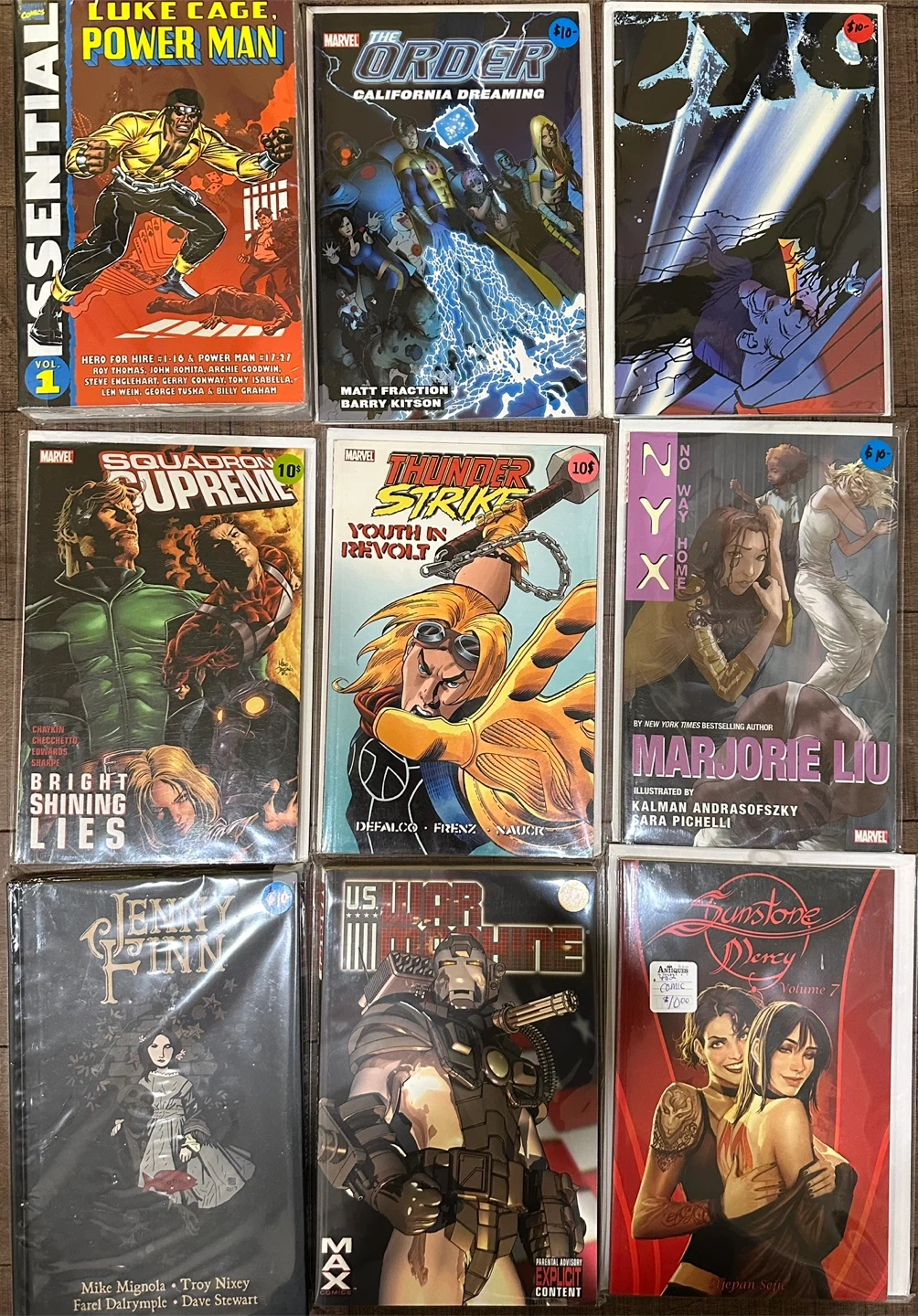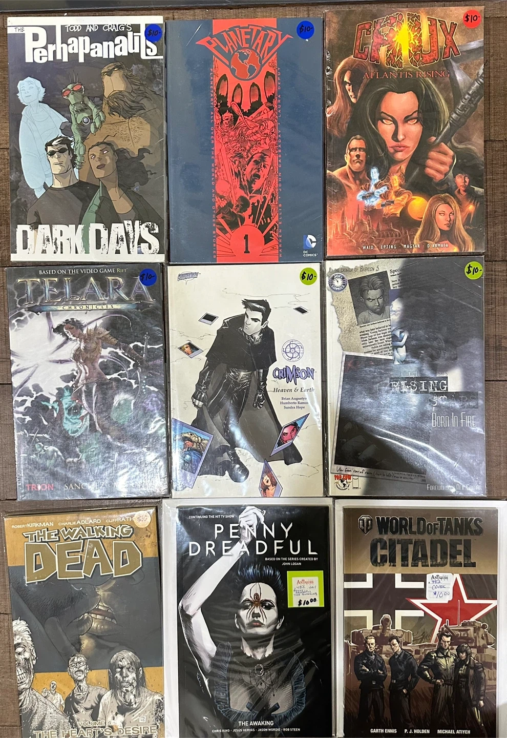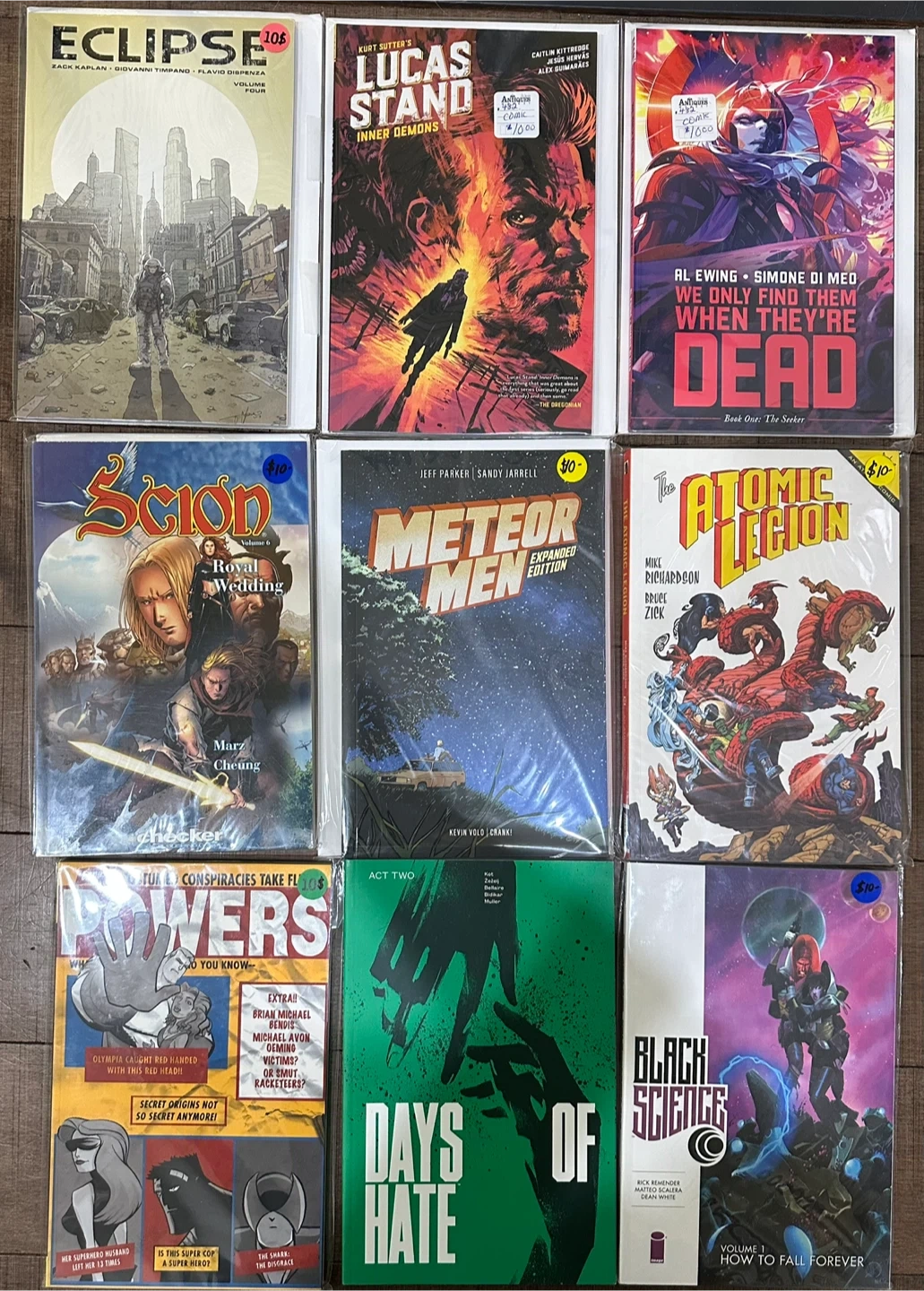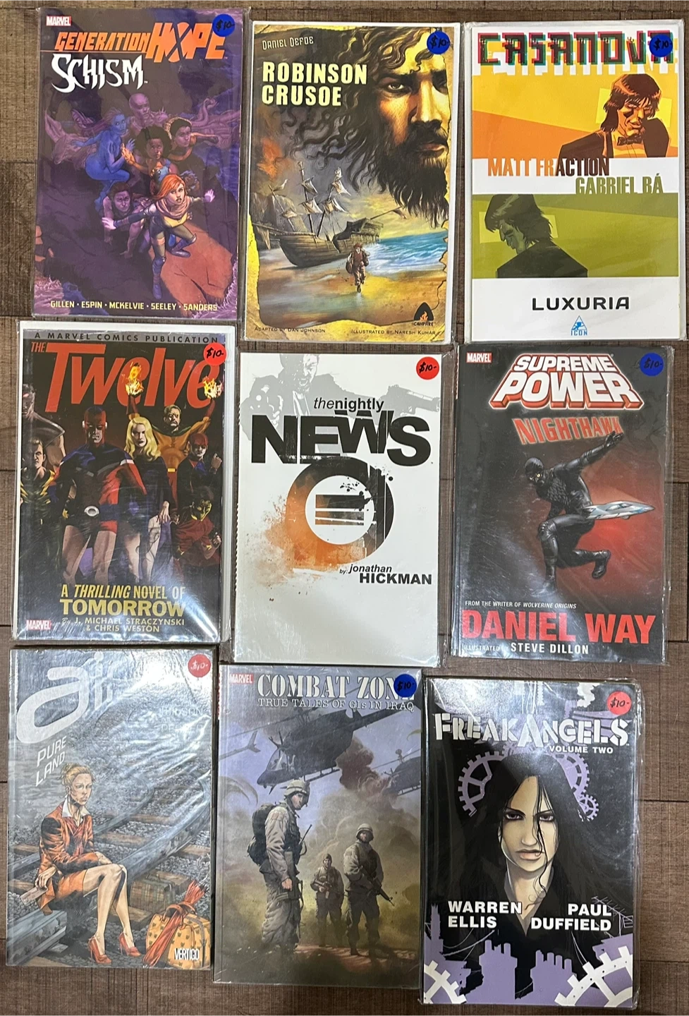 In new-like condition, various graphic novels. Various titles and publishers. Perfect for new collectors or experienced collectors looking to dive into new stories. Almost all priced at $10 each. Please contact me for more information if needed.