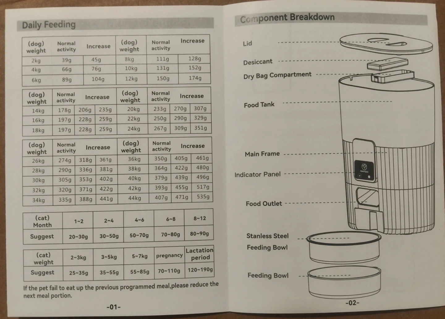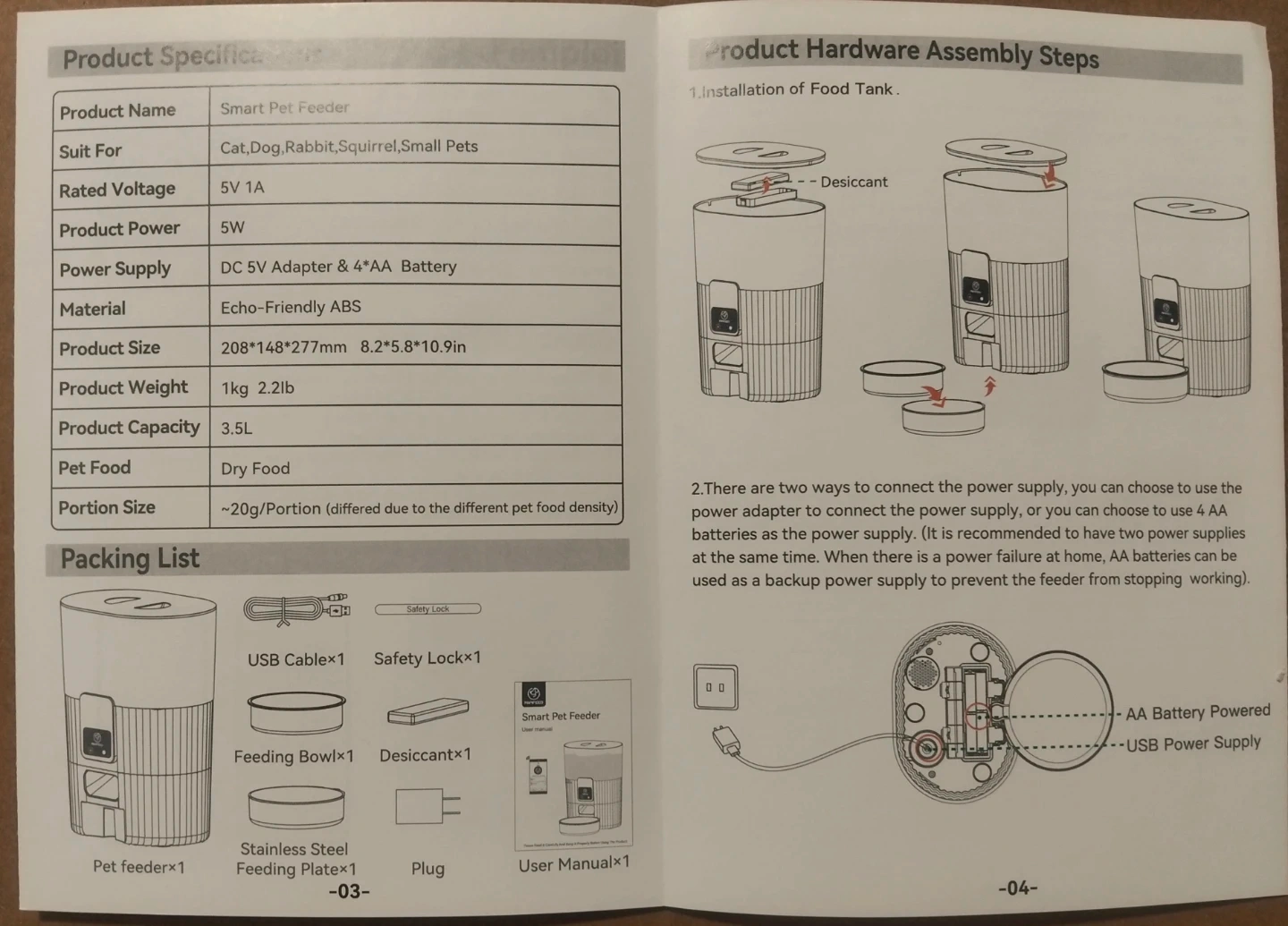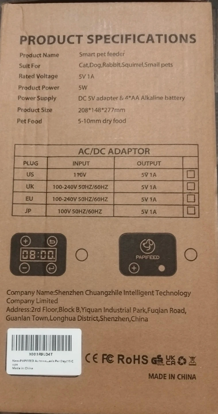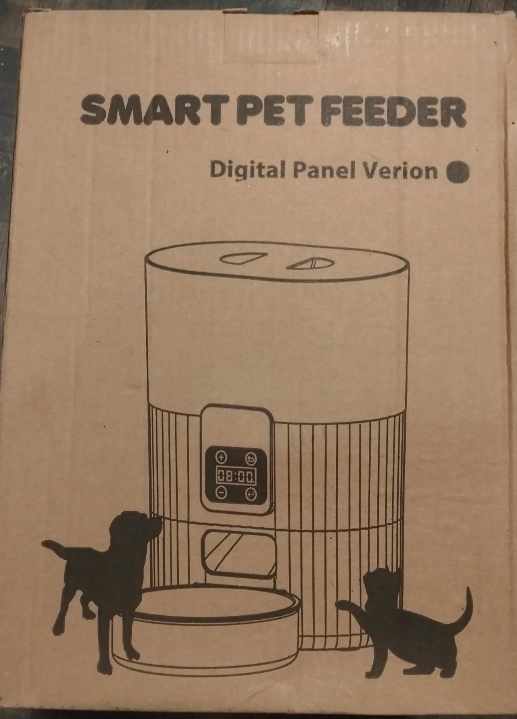 It's a digital panel version and suitable for cats, dogs, rabbits, squirrels, and other small pets. It uses a DC 5V adapter or 4*AA alkaline batteries. The product size is 208*148*277mm and is made for 5-10mm dry food. Comes with the user manual and the original box!