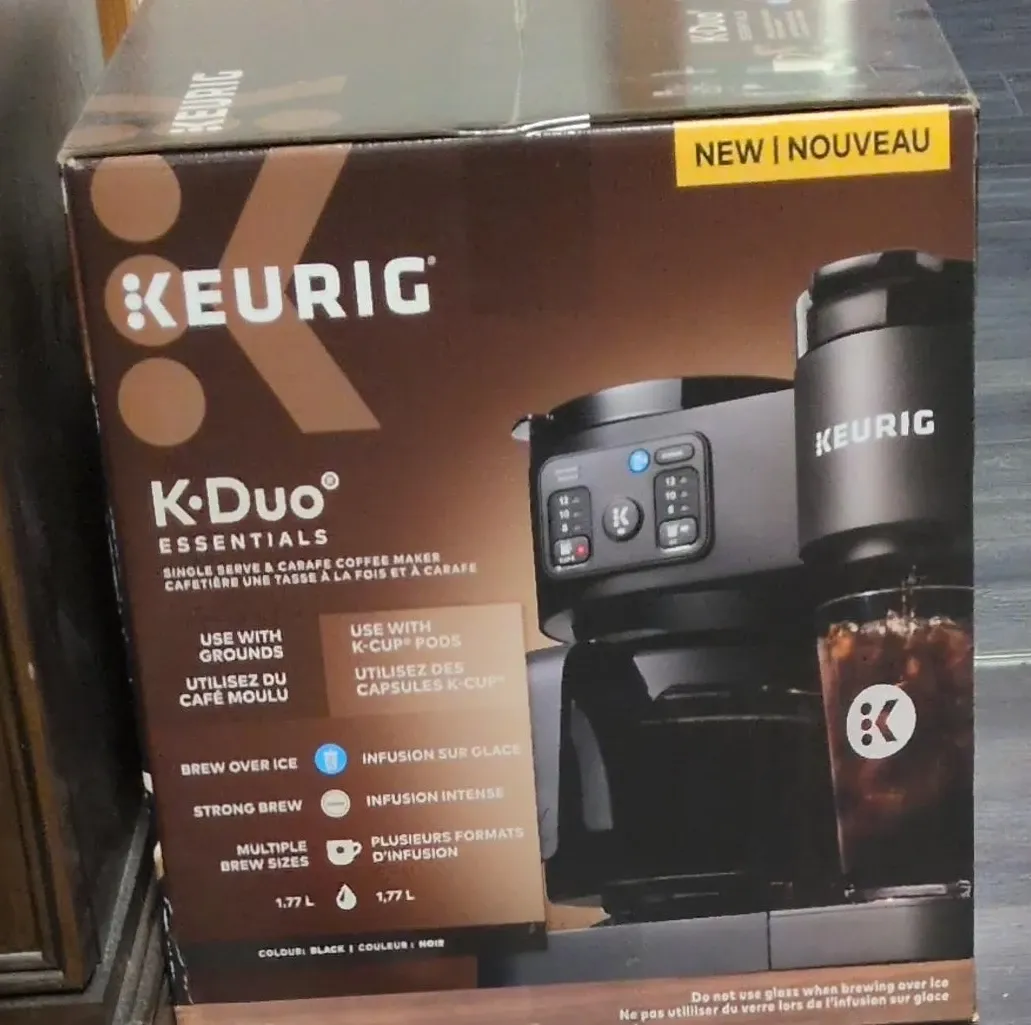 Selling a brand new Keurig K-Duo Essentials coffee maker in black! It's a single serve and carafe coffee maker, so you can brew a single cup or a whole carafe. It can be used with grounds or K-Cup pods. Brew over ice or make a strong brew, and choose from multiple brew sizes. Each reservoir holds 1.77 L. Box included!