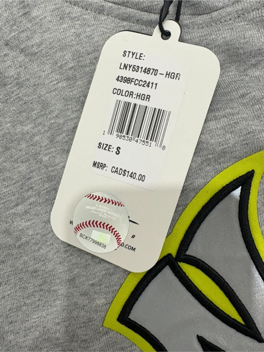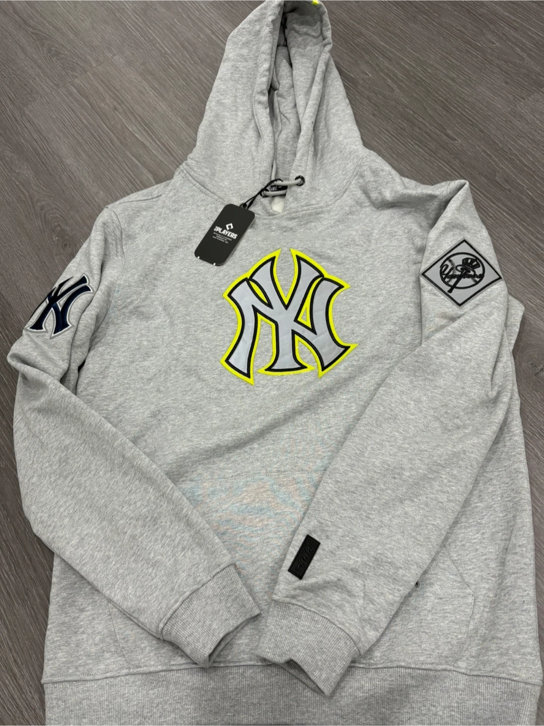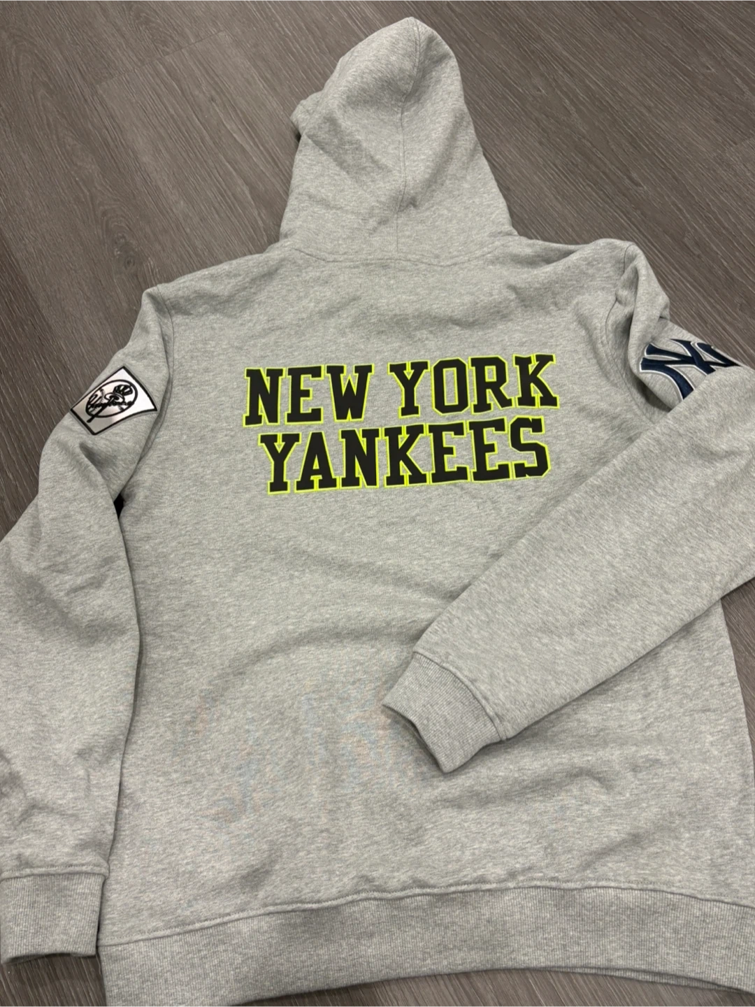 It comes in a stylish heather grey colour and features the iconic Yankees logo with sleeve patches.