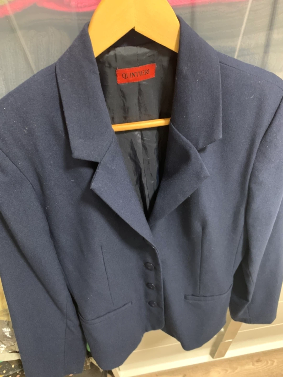 Here's a stylish navy blue blazer from Quintieri! It's in great condition and ready to wear. Perfect for adding a touch of class to any outfit