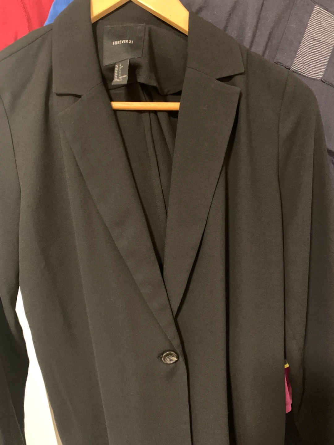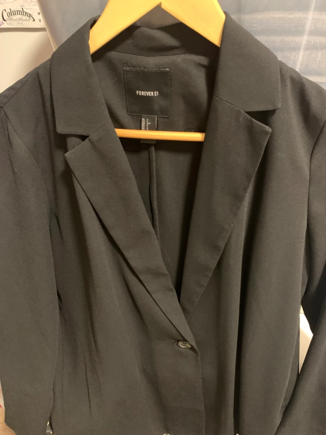 Selling a Forever 21 black blazer in size small. It's in great condition and perfect for dressing up or down! The material is comfortable and the style is classic and versatile