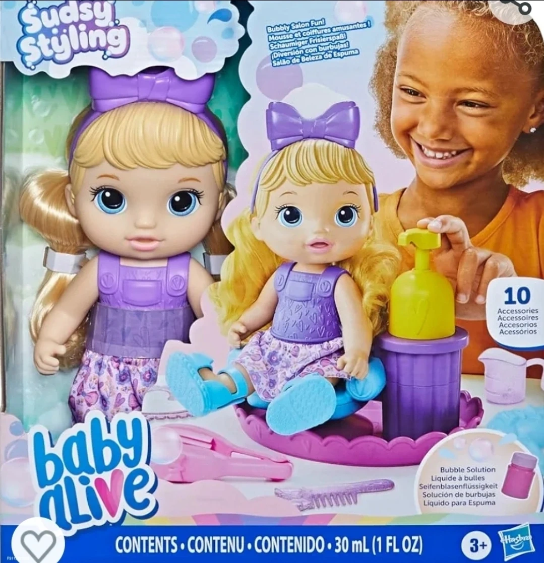 Selling a NEW Baby Alive Sudsy Styling doll. It comes with 10 accessories for bubbly salon fun! Includes a blonde hair doll, a salon chair, and styling accessories. Recommended for ages 3 and up