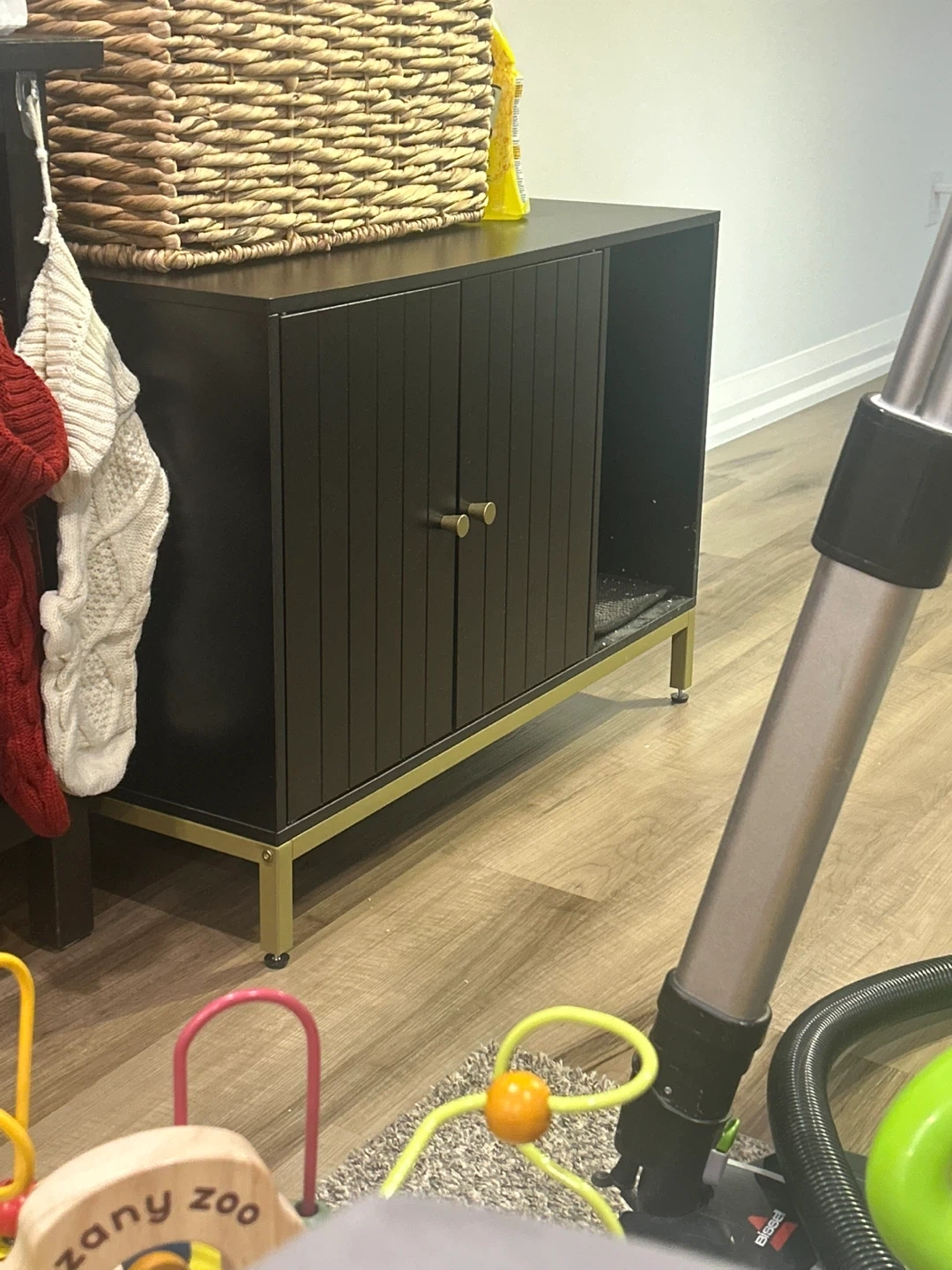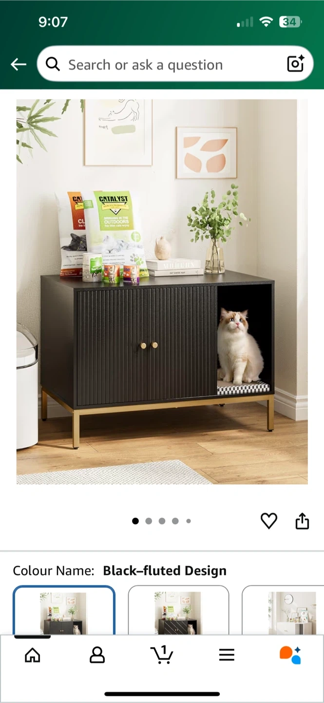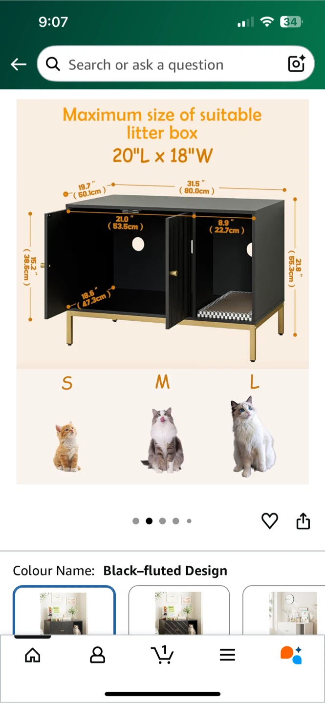 Selling a black fluted design cat litter box cabinet! It fits a maximum litter box size of 20"L x 18"W. Dimensions are 31.5" (80 cm) wide, 19.7" (50.1 cm) deep, and 24.9" (63.3 cm) high