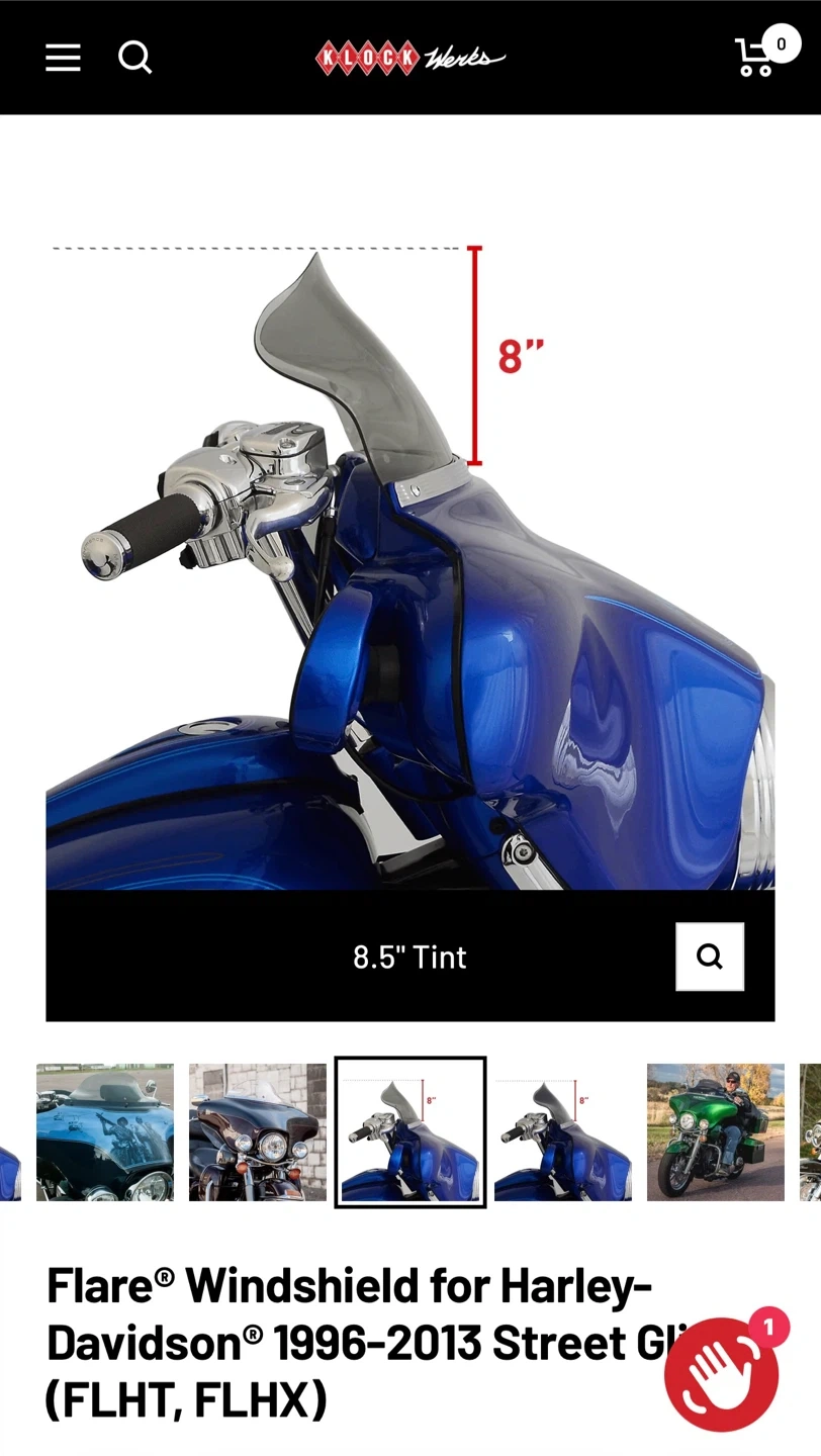 Selling a Klock Werks Flare Windshield for Harley-Davidson. It fits 1996-2013 Street Glide models (FLHT, FLHX). The windshield has an 8.5" tint and measures 8" in height.