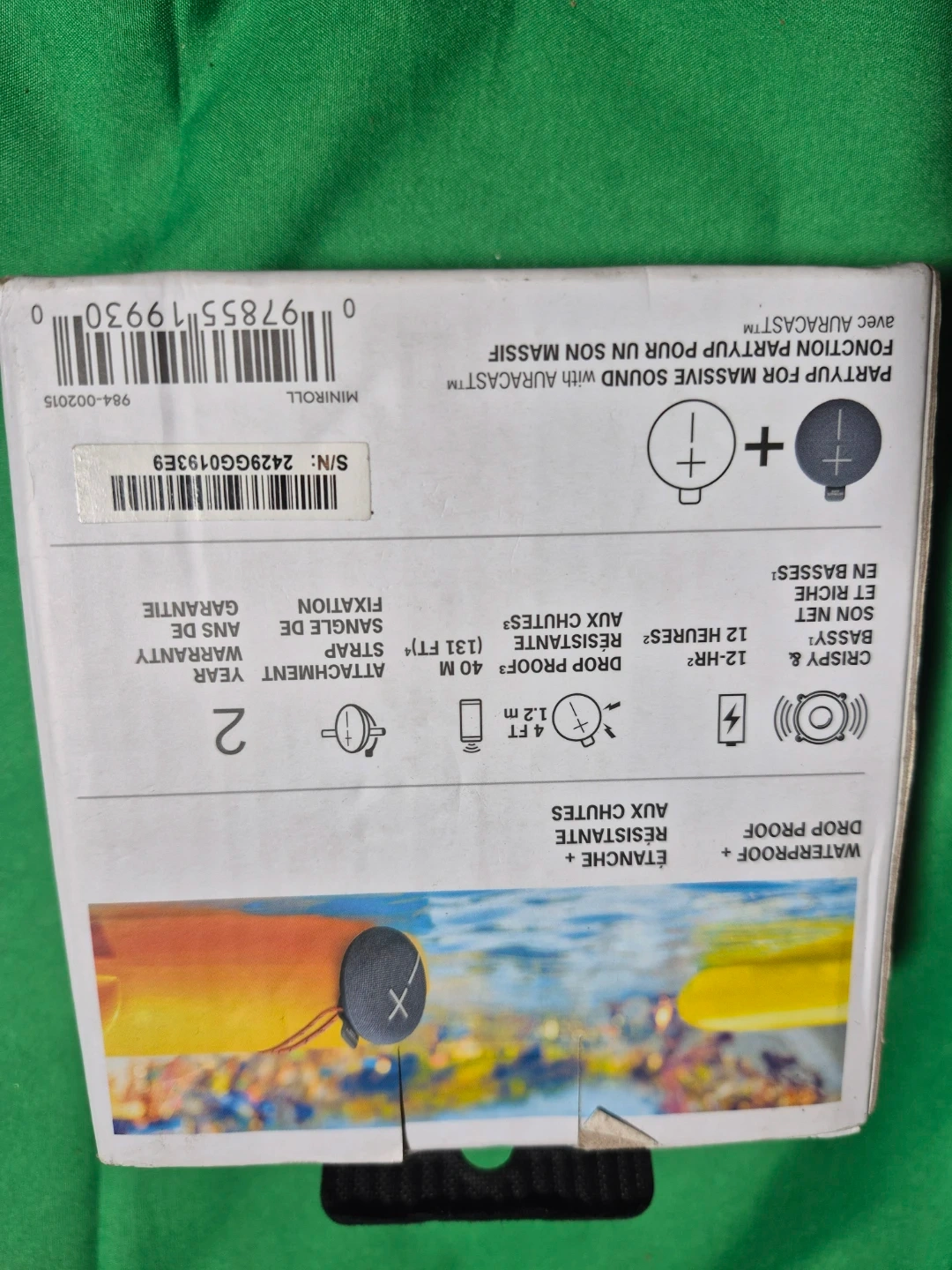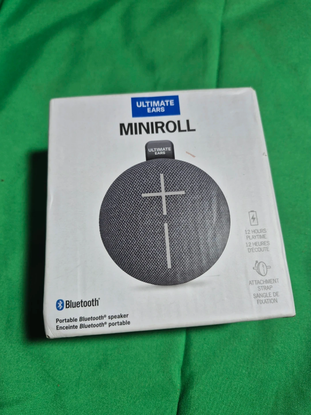 Selling an Ultimate Ears Miniroll portable Bluetooth speaker. It's waterproof, drop proof, and has an attachment strap. The box says it has 12 hours of playtime. Box included! Never used