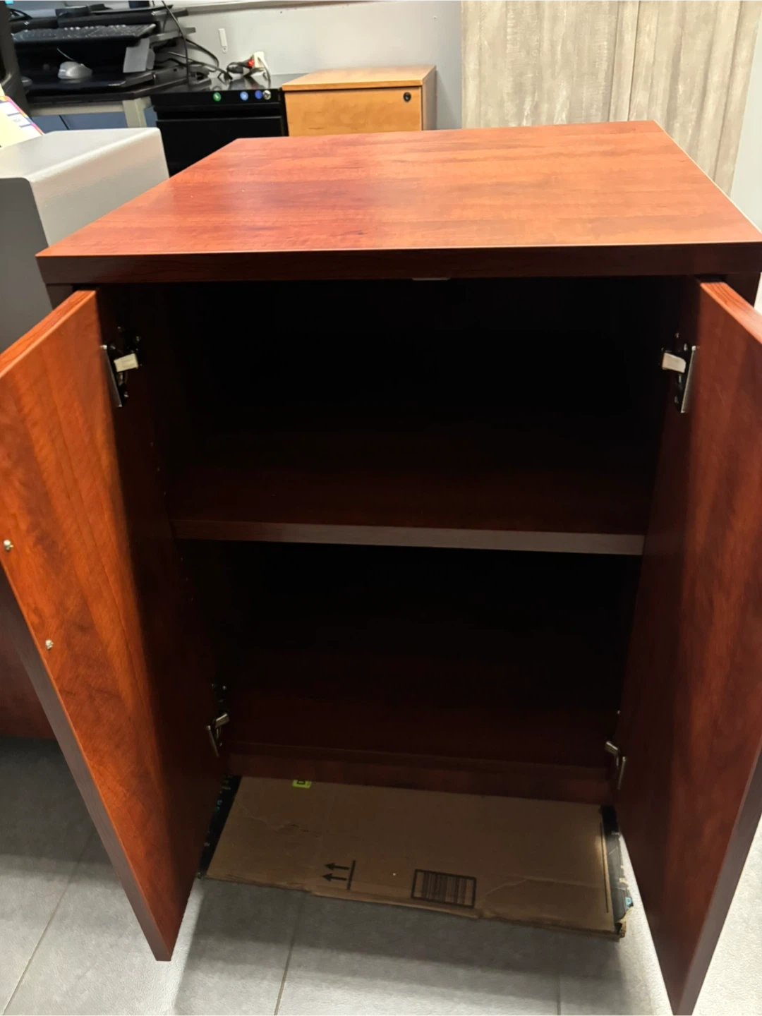 Sturdy wooden cabinet with doors, perfect for extra storage in your home or office. It's in good condition and ready to use. It has a nice, warm wood tone that would fit well in many spaces. Comes with a lock and key.