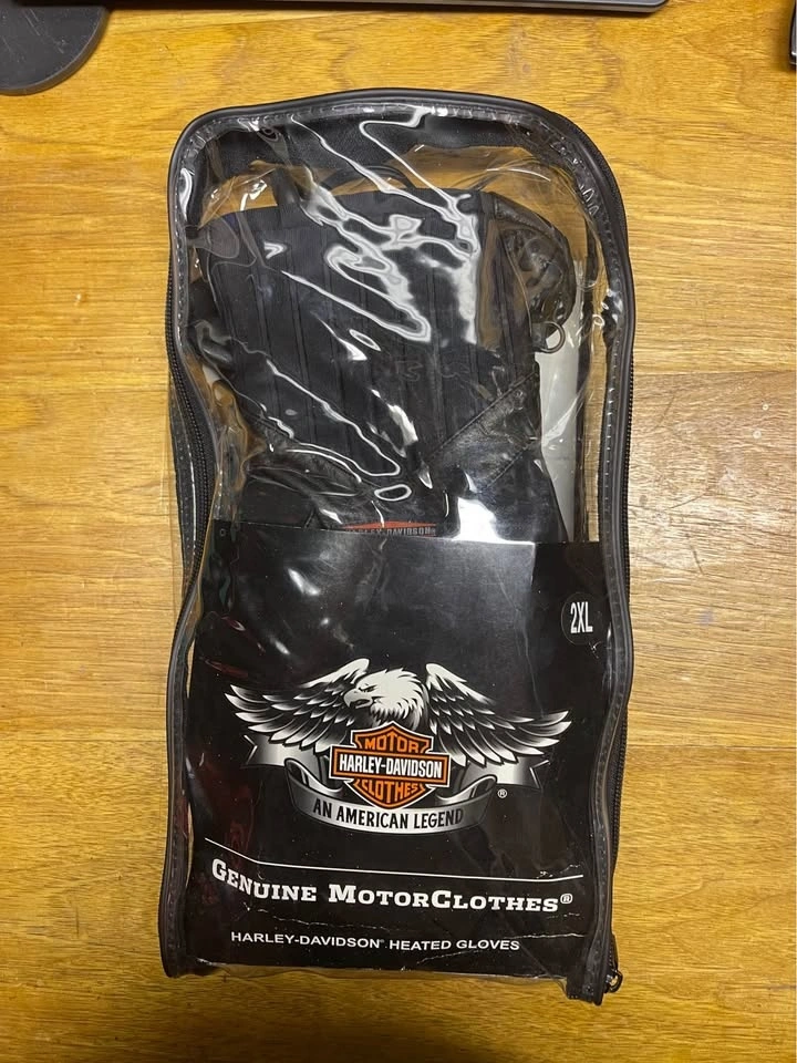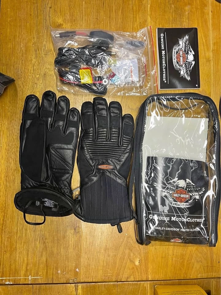 Harley-Davidson Men’s Electric Heated Gloves in black leather (size XXL). These are premium winter riding gloves designed for motorcycle use, featuring 12V heating elements for warmth. They wire to the bike, they are not battery operated, with a sleek black design with the Harley-Davidson logo, and high-quality leather construction for durability and protection.