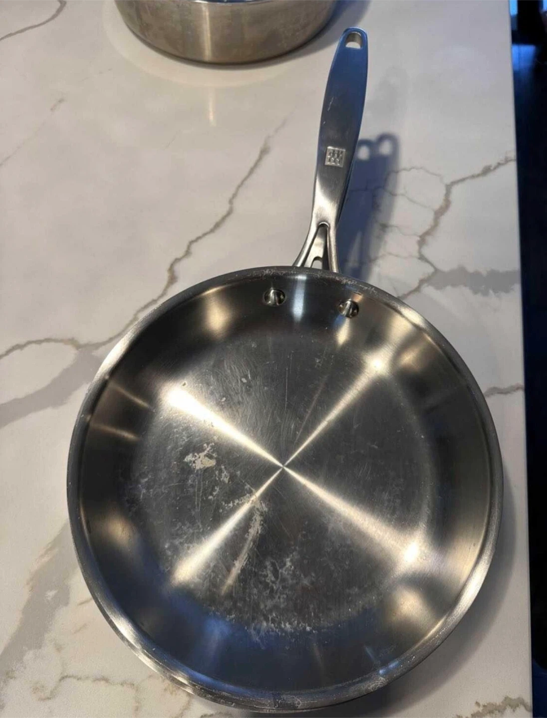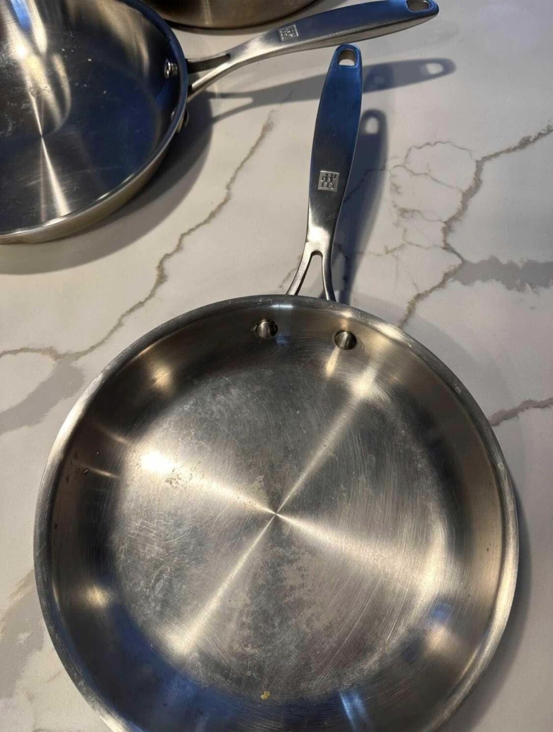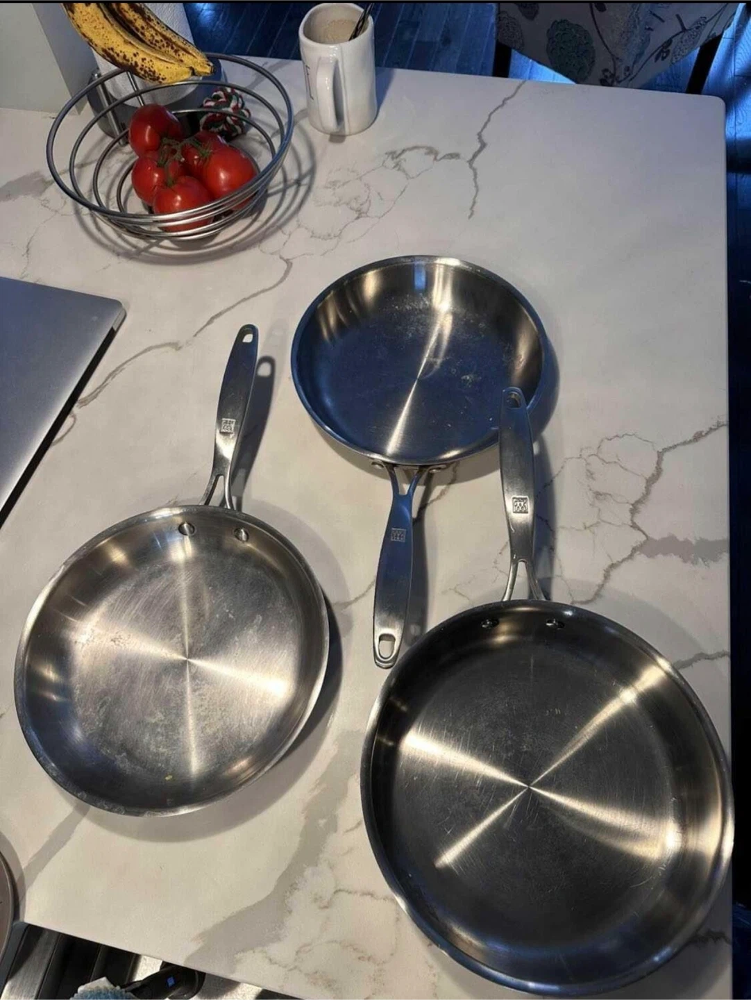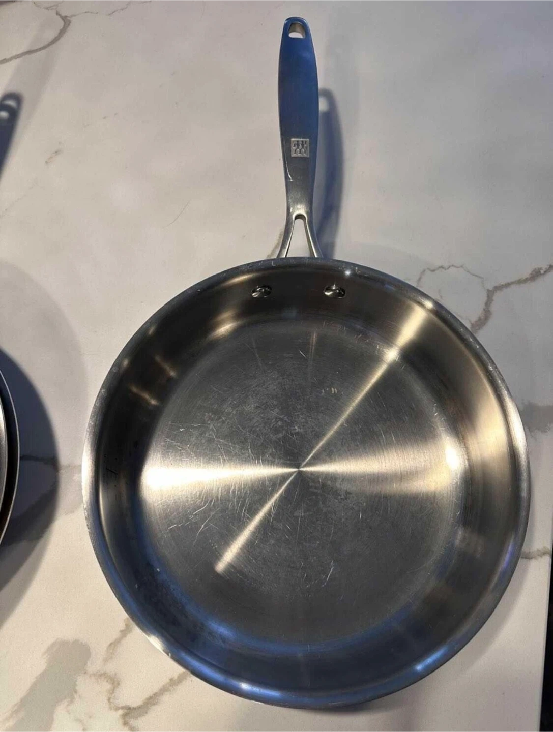 Selling a Zwilling J.A. Henckels stainless steel fry pan set of 3. It has some signs of use, but it's still in good condition for cooking up your favourite meals!