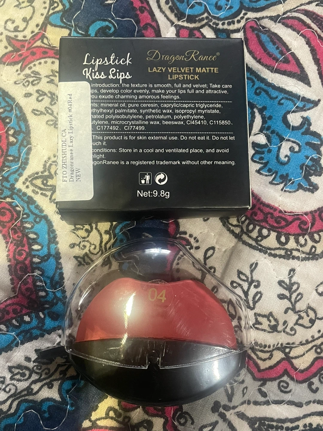 Selling a Dragon Ranee Lazy Velvet Matte Lipstick in the Kiss Lips shade #04! The texture is smooth, full, and velvety, making your lips full and attractive. The box is included, and the product is for external use only. Store in a cool and ventilated place, and avoid light
