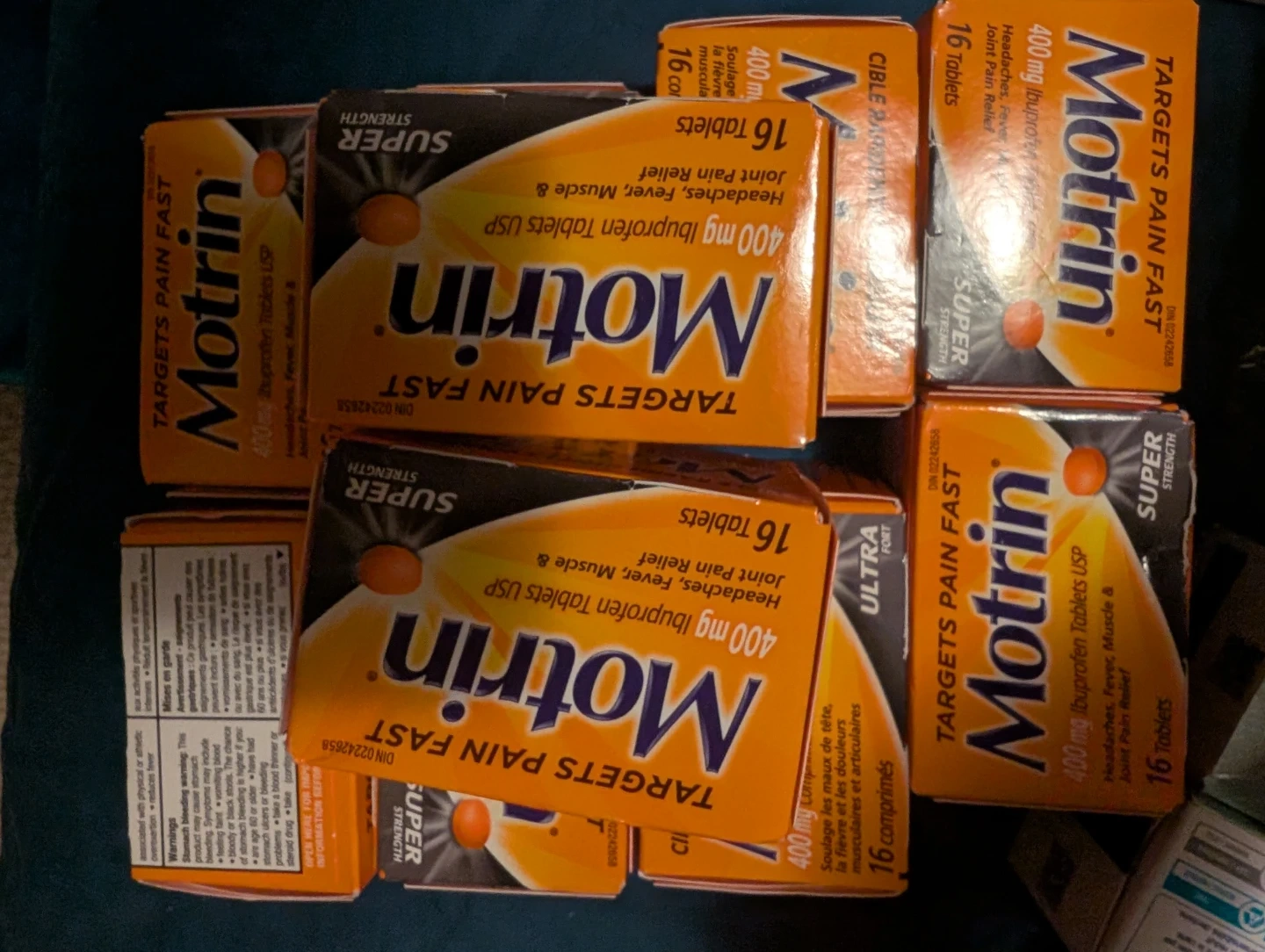 I'm selling boxes of Motrin Targets Pain Fast, each containing 16 tablets of 400mg Ibuprofen USP. Great for headaches, fever, muscle and joint pain relief!