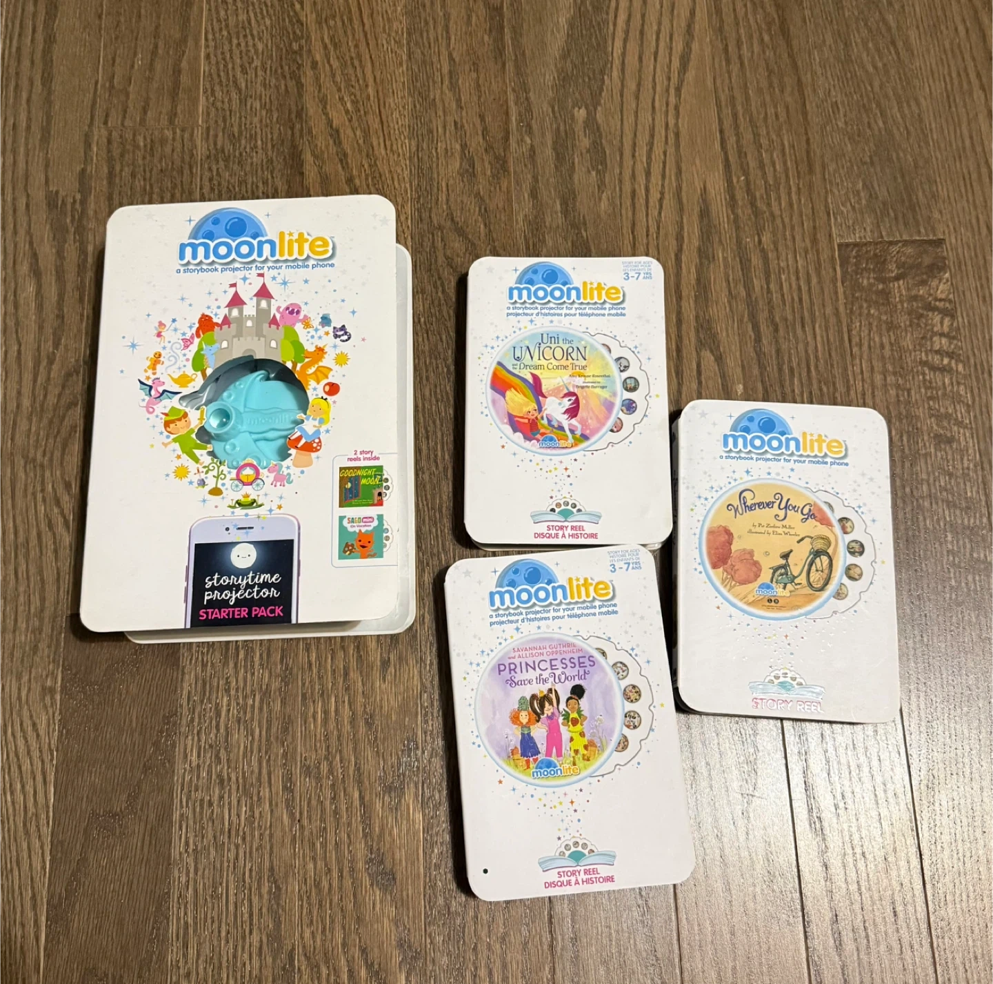 Get ready for some magical storytime with this Moonlite projector! It's a storybook projector for your mobile phone. Comes with the starter pack and 5 story reels. Recommended for ages 3-7 years