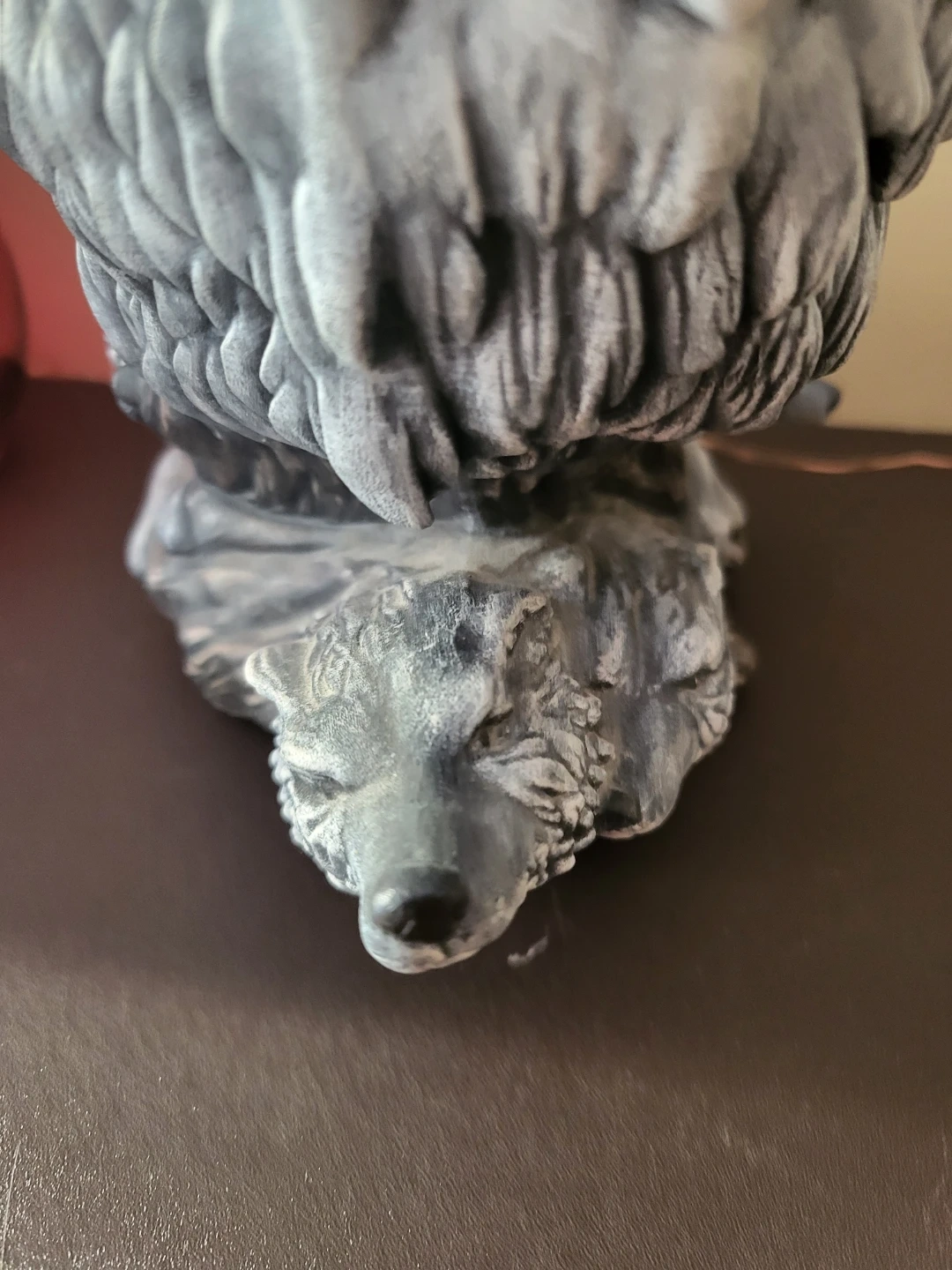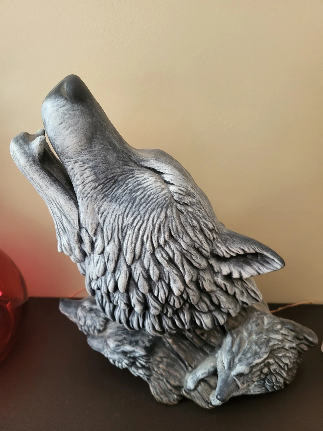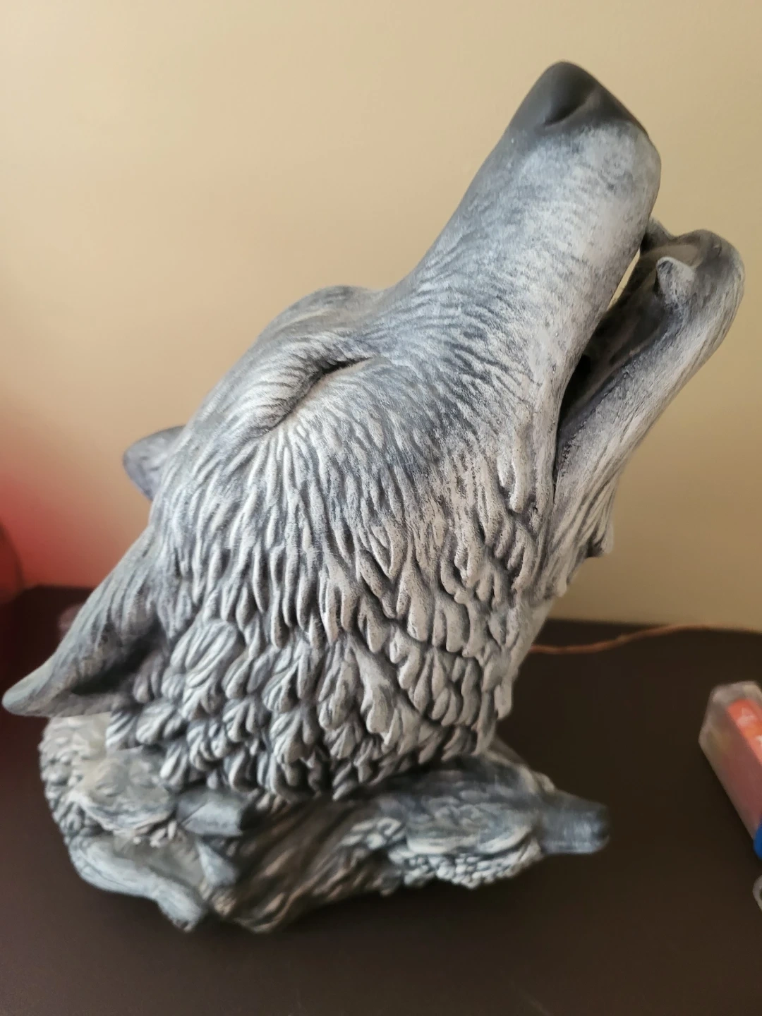 Here's a cool wolf head statue for your home! It's in great shape and would look awesome on a shelf or desk. The statue is gray and has a very detailed design. It would be a great addition to any room!