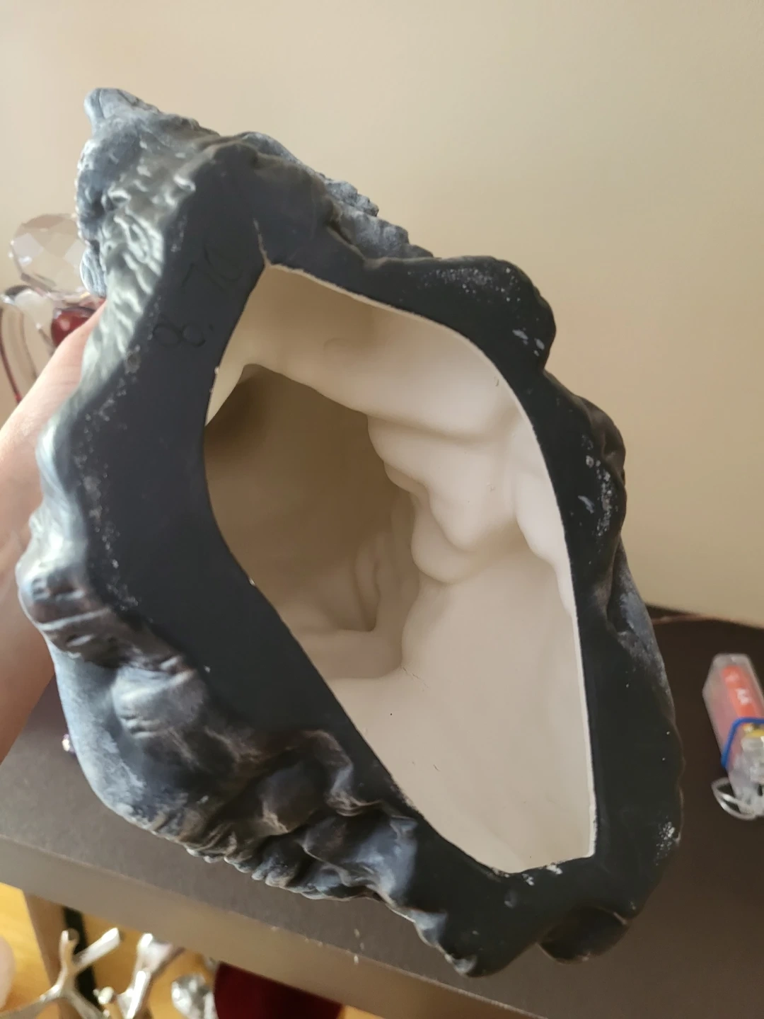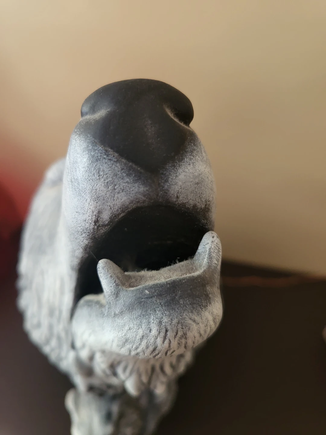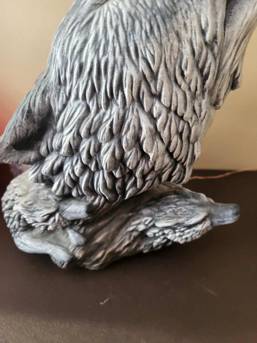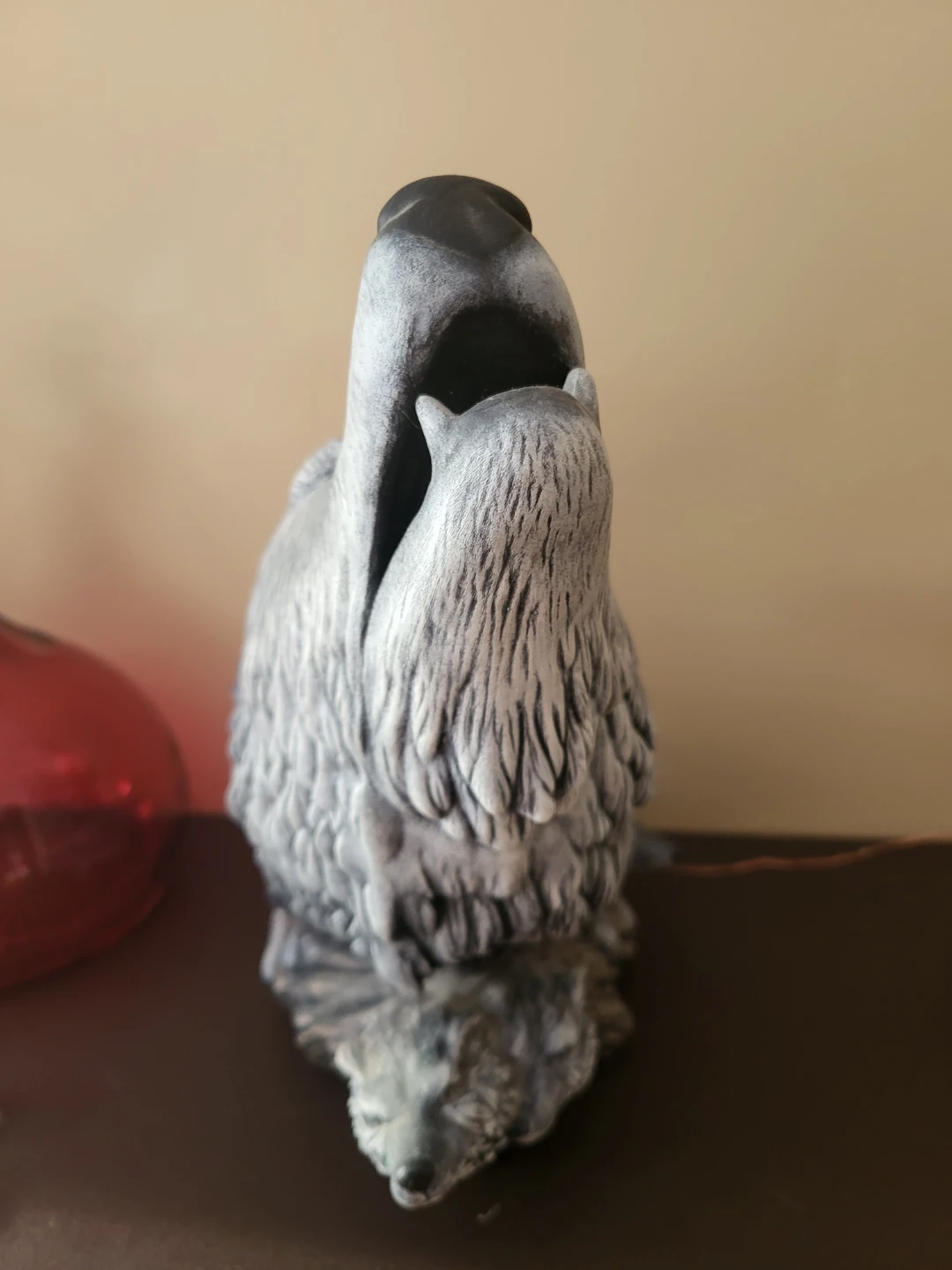 Here's a cool wolf head statue for your home! It's in great shape and would look awesome on a shelf or desk. The statue is gray and has a very detailed design. It would be a great addition to any room!