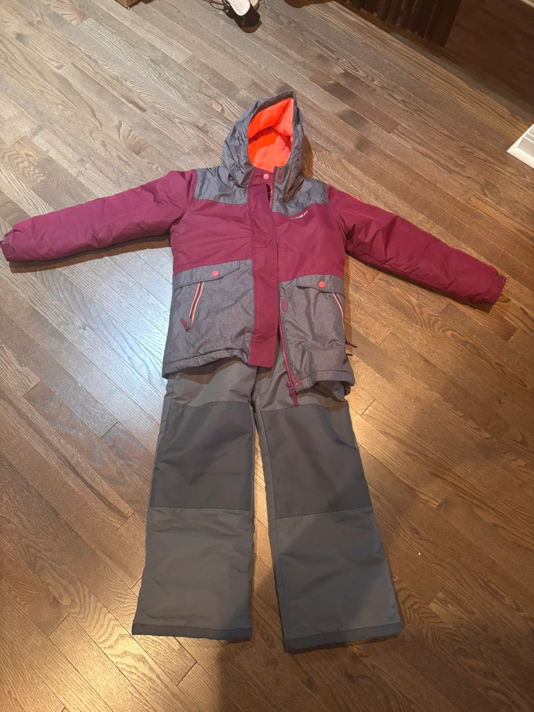 Selling a kids' snowsuit set, including a jacket and pants. The set is in good condition and ready for some winter fun! The jacket is a mix of maroon and grey, with an orange lining in the hood. The pants are grey. Perfect for keeping your little one warm and dry during outdoor activities.