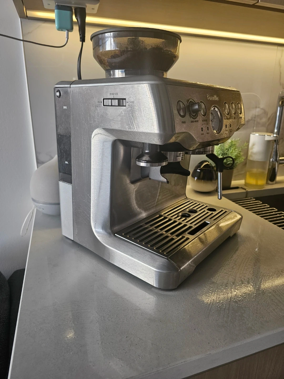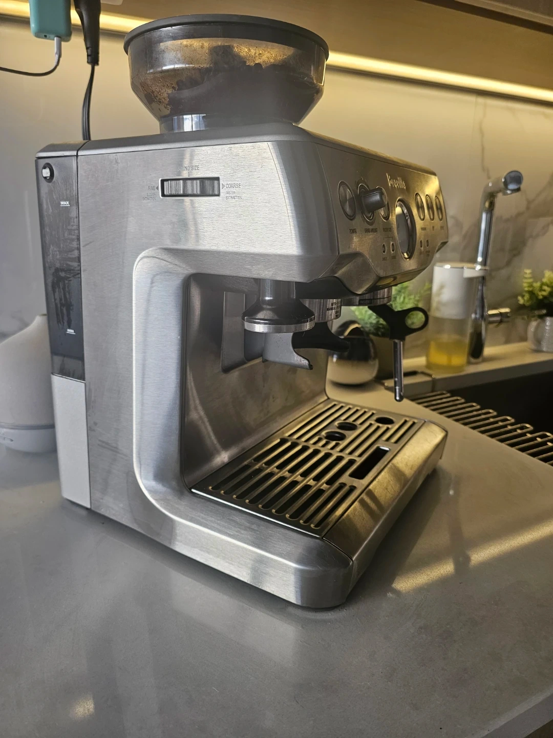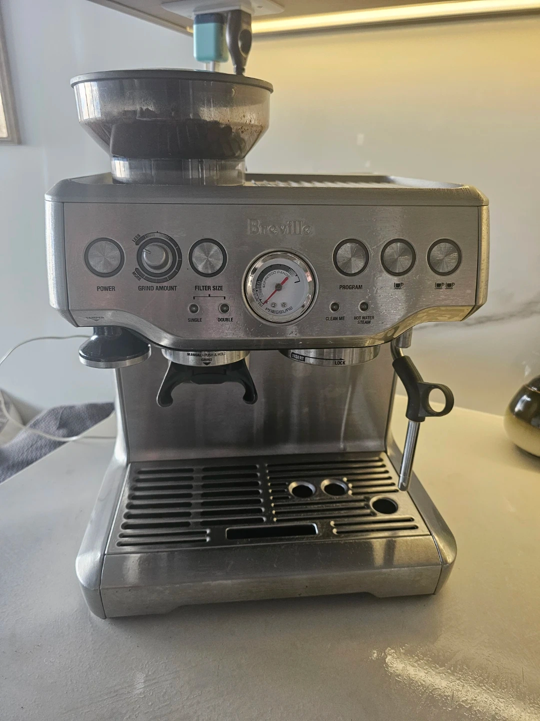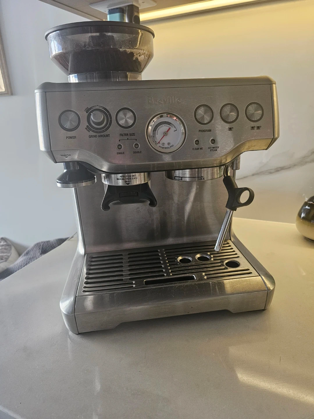 Selling a Breville Barista Express espresso machine. It's in great condition and ready to make some delicious coffee! This machine is perfect for anyone who loves the taste of freshly brewed espresso at home. It features a built-in grinder and steam wand for easy milk frothing. Also has self cleaning!