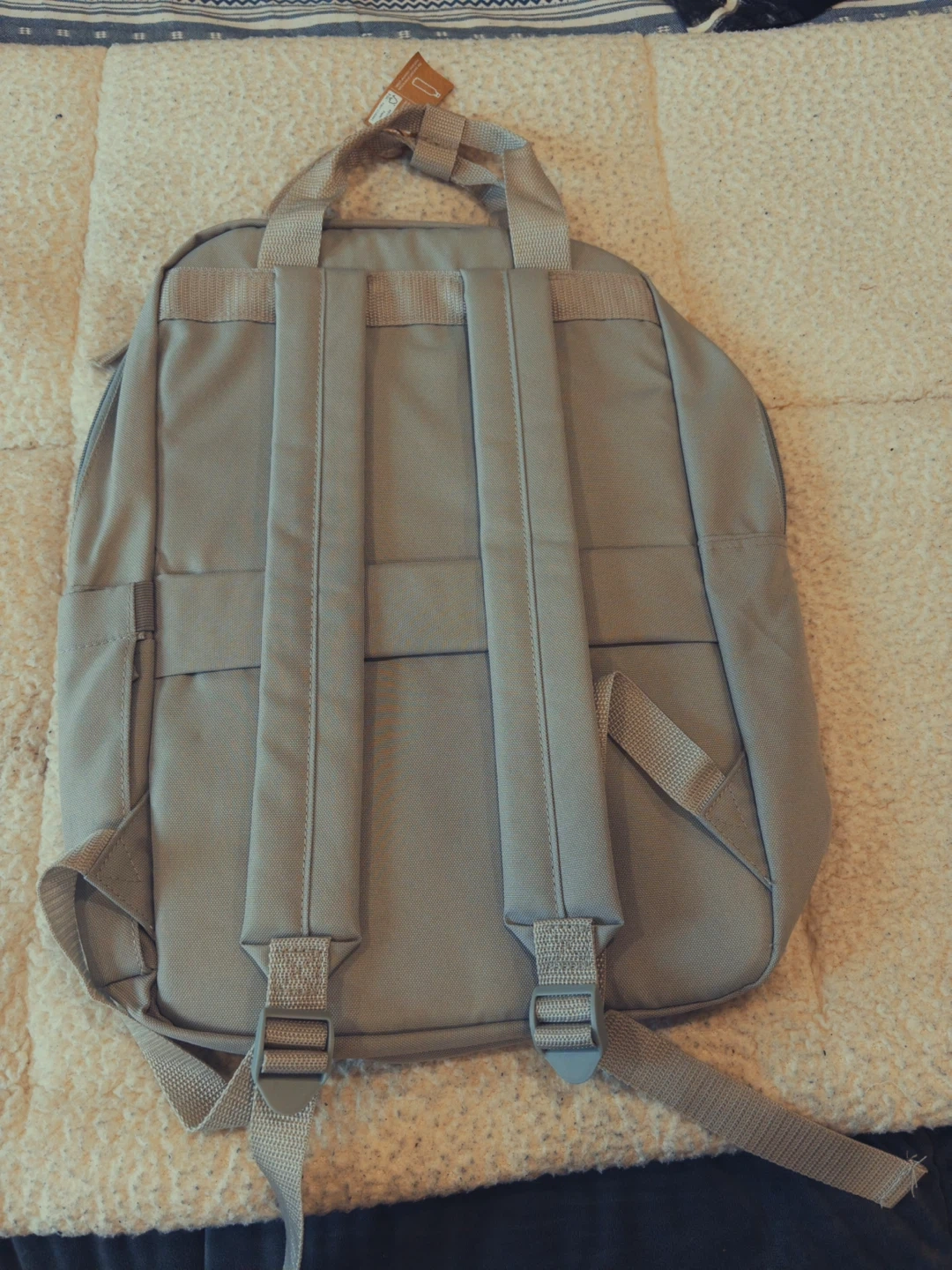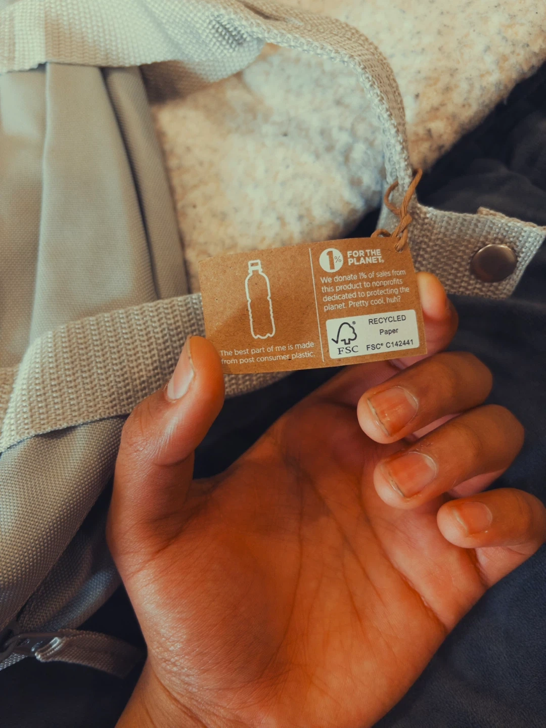 Here's a Genumark backpack in a neutral grey colour! It's in great shape and ready for your next adventure or daily commute. It's made from recycled paper and post-consumer plastic!