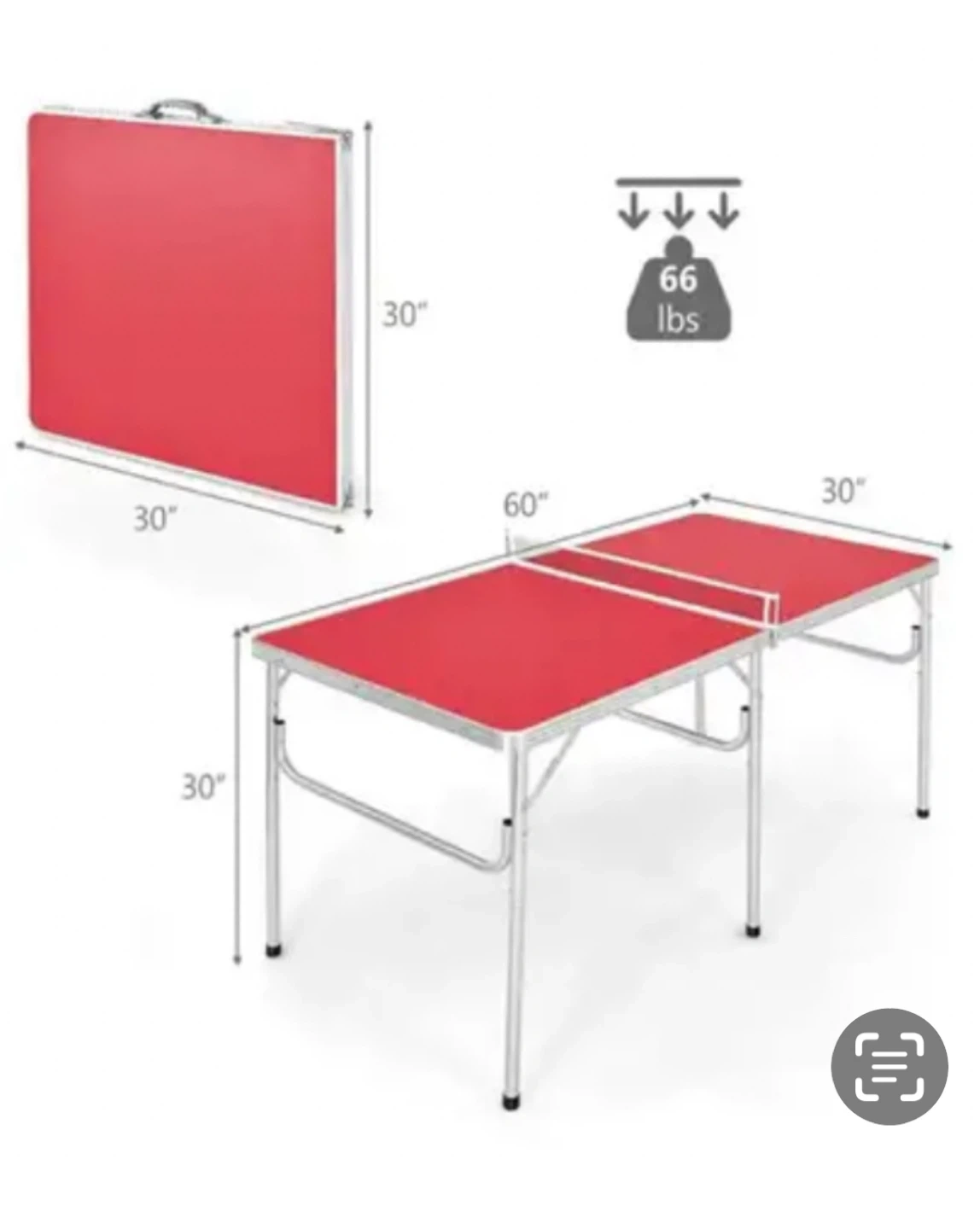 Selling a foldable ping pong table! When open, it measures 60" x 30", and it folds down to 30" x 30" for easy storage. It can support up to 66 lbs. used only once, like new!