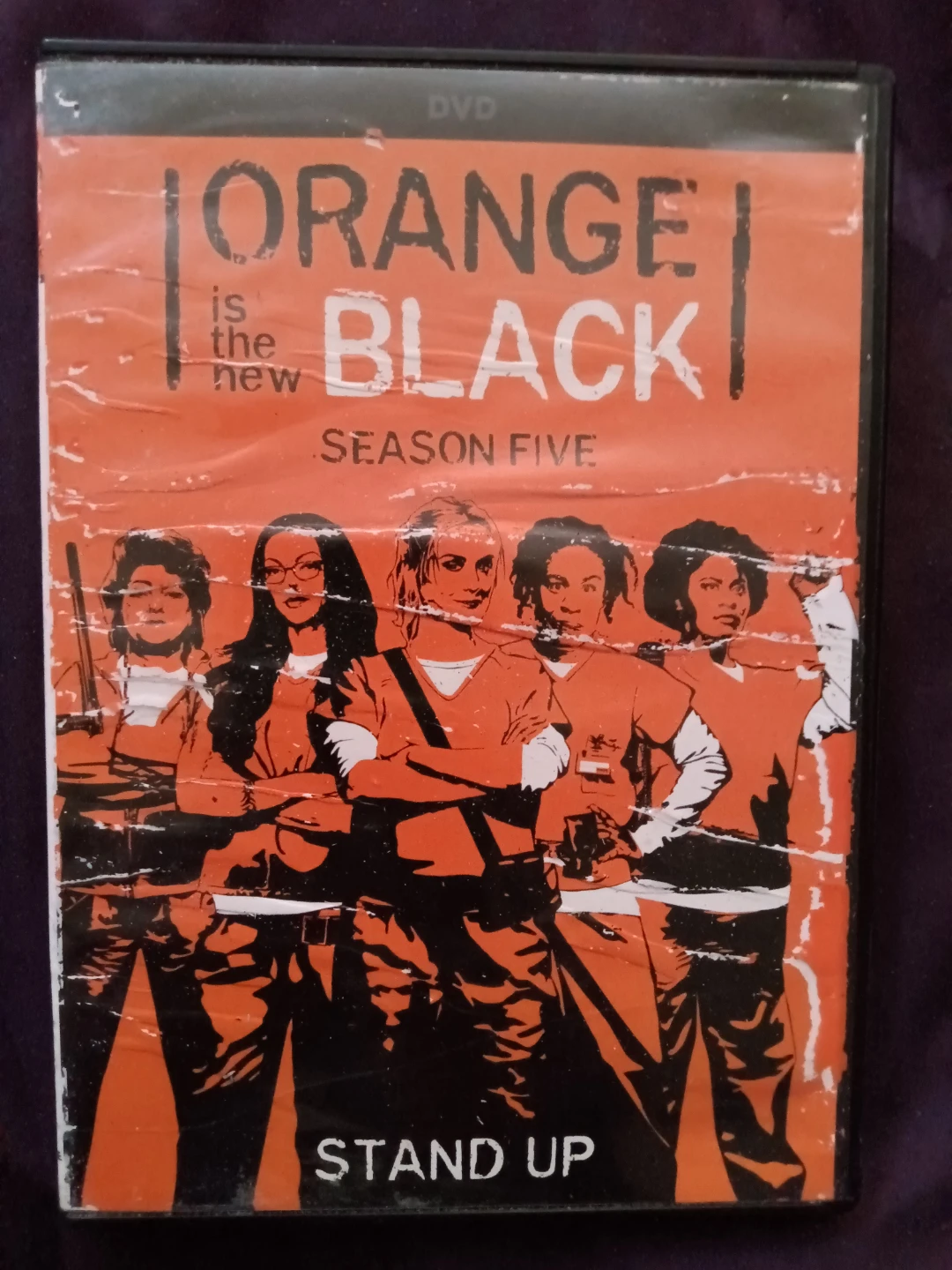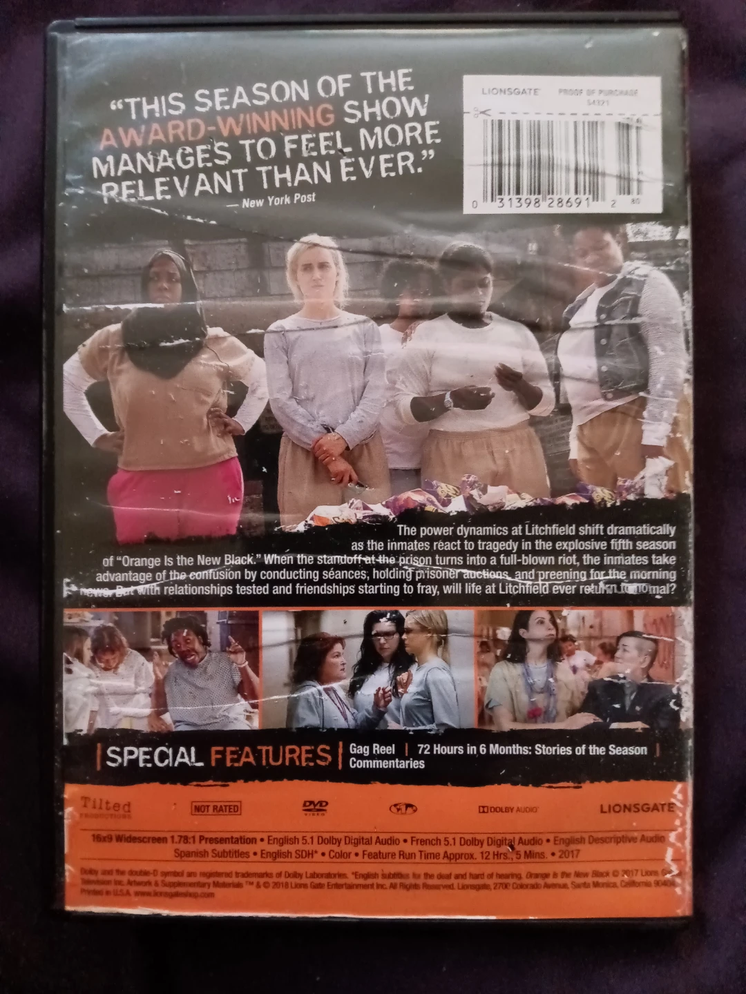 Selling Orange Is The New Black, Season Five on DVD! It includes special features like a gag reel and 72 hours in 6 months: stories of the season commentaries. The DVD has English 5.1 Dolby Digital Audio, French 5.1 Dolby Digital Audio, and English Descriptive Audio. It also has Spanish subtitles and English SDH. The feature run time is approximately 12 hours and 5 minutes