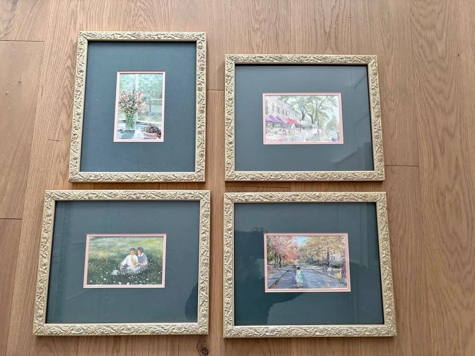 4 pretty framed pictures with matting. $20 Insert your own picture. All frames the same size! Unfortunately, one glass just broke. See my other listings!