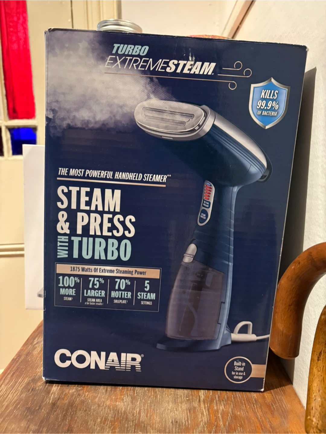 I'm selling a Conair Turbo ExtremeSteam handheld steamer! It's the most powerful handheld steamer, with 1875 watts of extreme steaming power. It kills 99.9% of bacteria! It has five steam settings, and the built-in stand is great for use and storage. Comes with the box