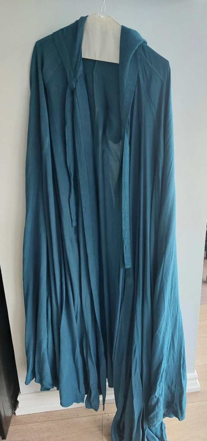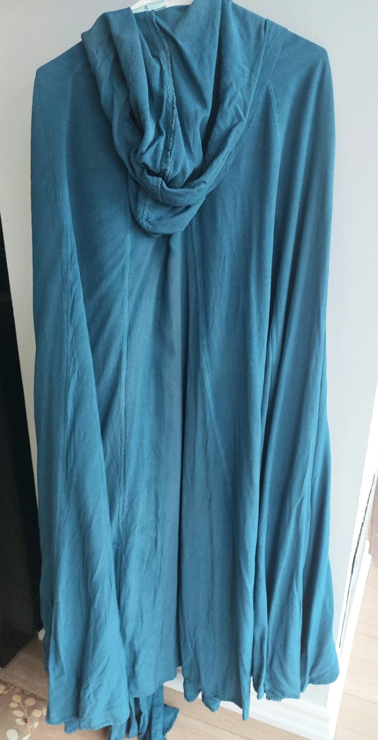 A Holy Clothing Carys hooded cloak in Majolica Blue, size large. It features a tie closure at the neck. Perfect for adding a touch of flair to your wardrobe. Great for Ren Faire, LARP, etc.