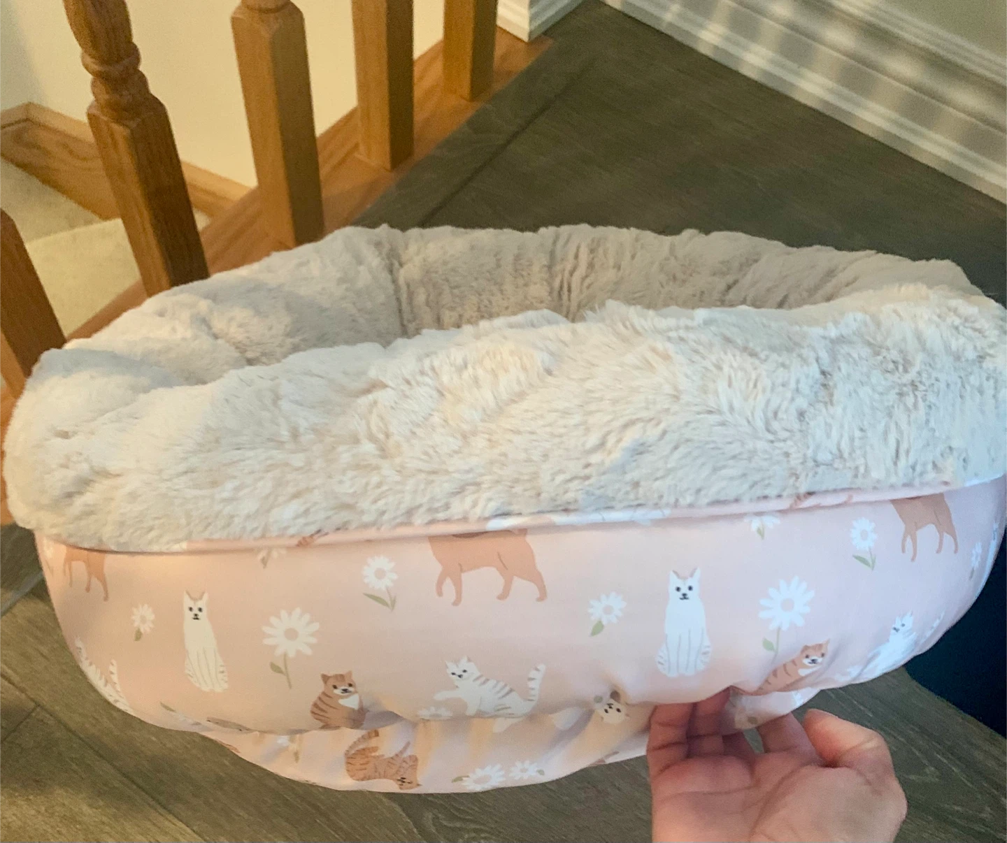 Selling a super comfy cat bed! It's a soft, plush bed with a cute pink cat print around the outside. Perfect for your furry friend to curl up in for a nap