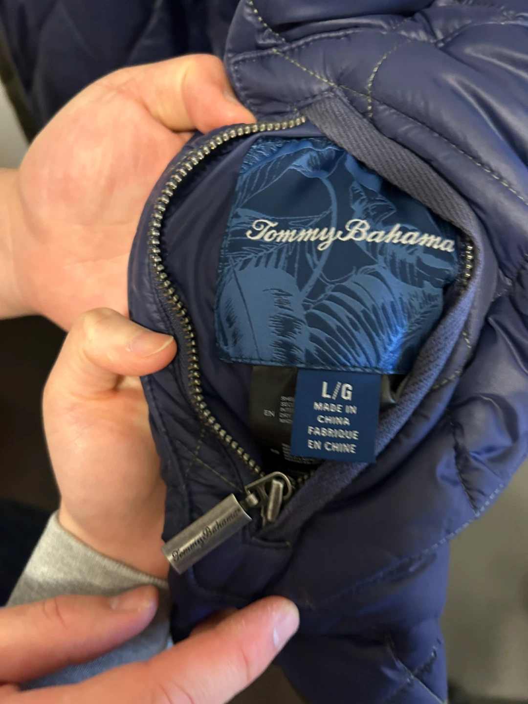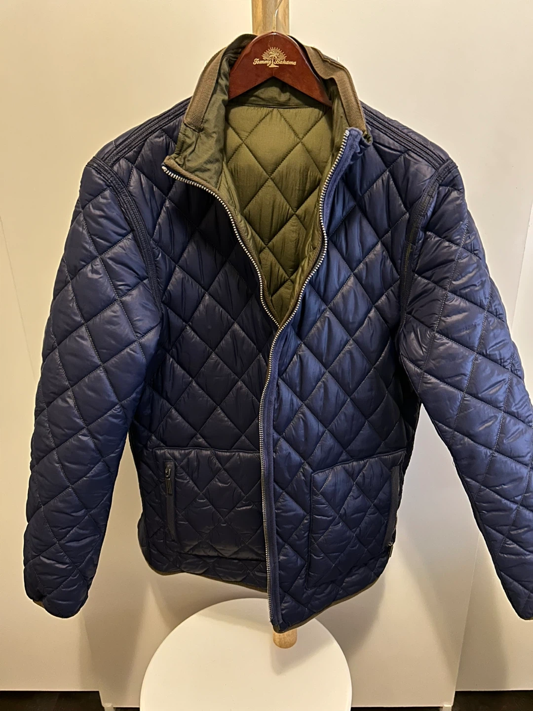 Tommy Bahama reversible quilted jacket in size L. It has an olive green and navy blue colour scheme. It's in great condition and ready for a new owner!