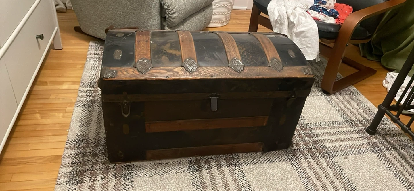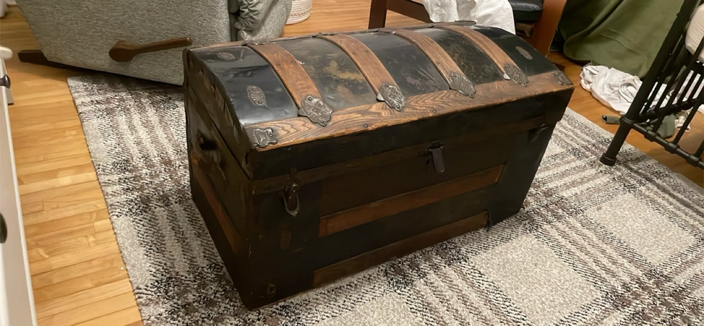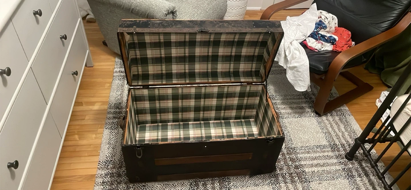 Selling an antique steamer trunk. It's in good condition for its age, with some wear and tear as shown in the photos. The interior is lined with a plaid fabric.