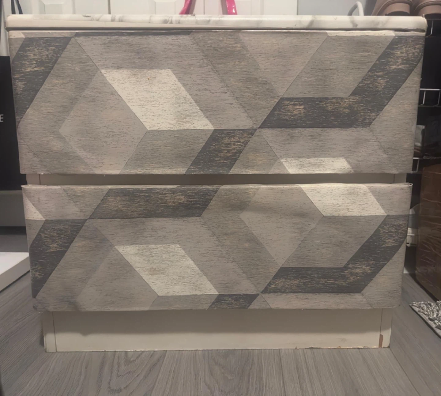 Selling a bedside table with two drawers. It features a marble-look top and a geometric pattern on the drawer fronts. It's in good condition and ready to use!
