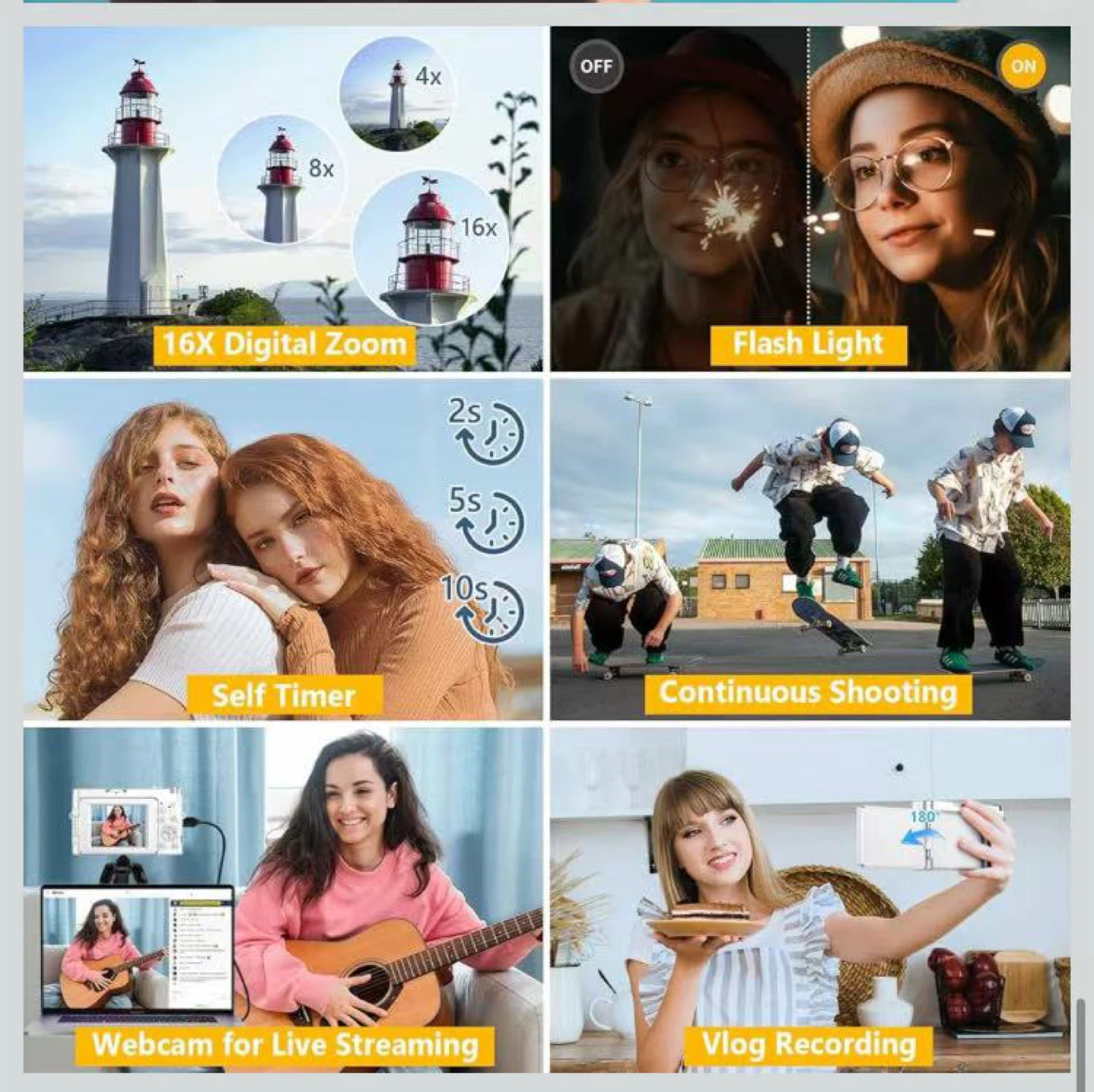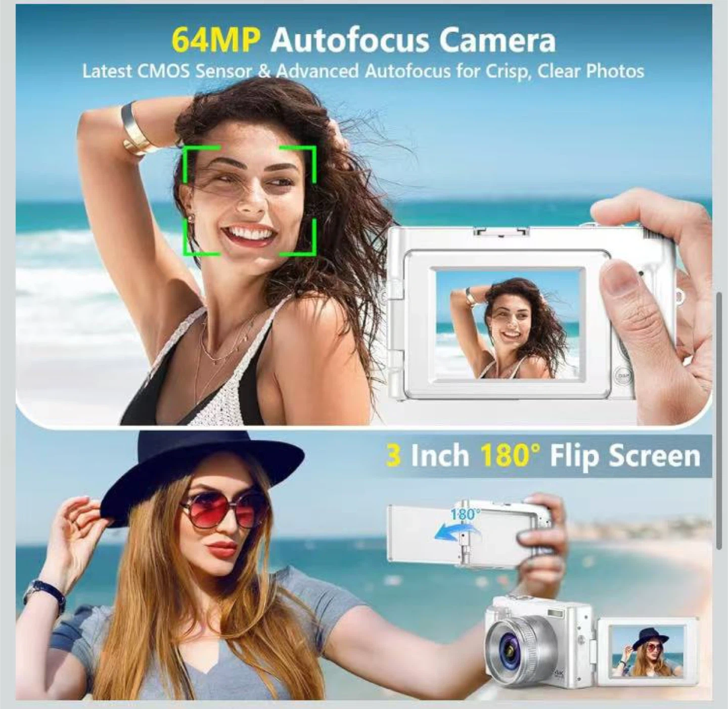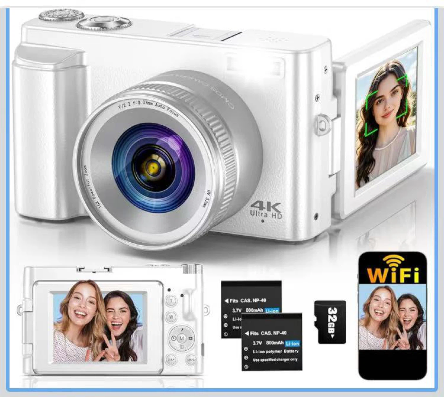 4K Digital Camera for Photography Autofocus, 64MP WiFi Vlogging Camera for YouTube with 2 Batteries, SD Card, 3" 180°Flip Screen Selfie Compact Travel Camera for Teens with 16X Zoom, Anti-Shake, White