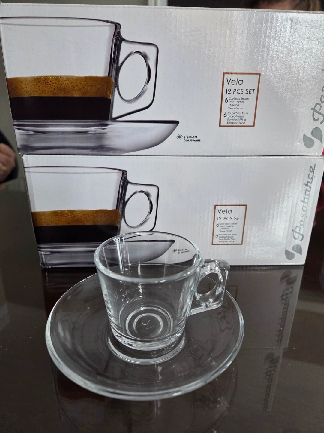 Selling a brand new 24-piece espresso cup set! This set includes 12 cups and 12 saucers, all made of clear glass. It's a stylish and modern design, perfect for enjoying your favourite espresso. The set is still in its original box.