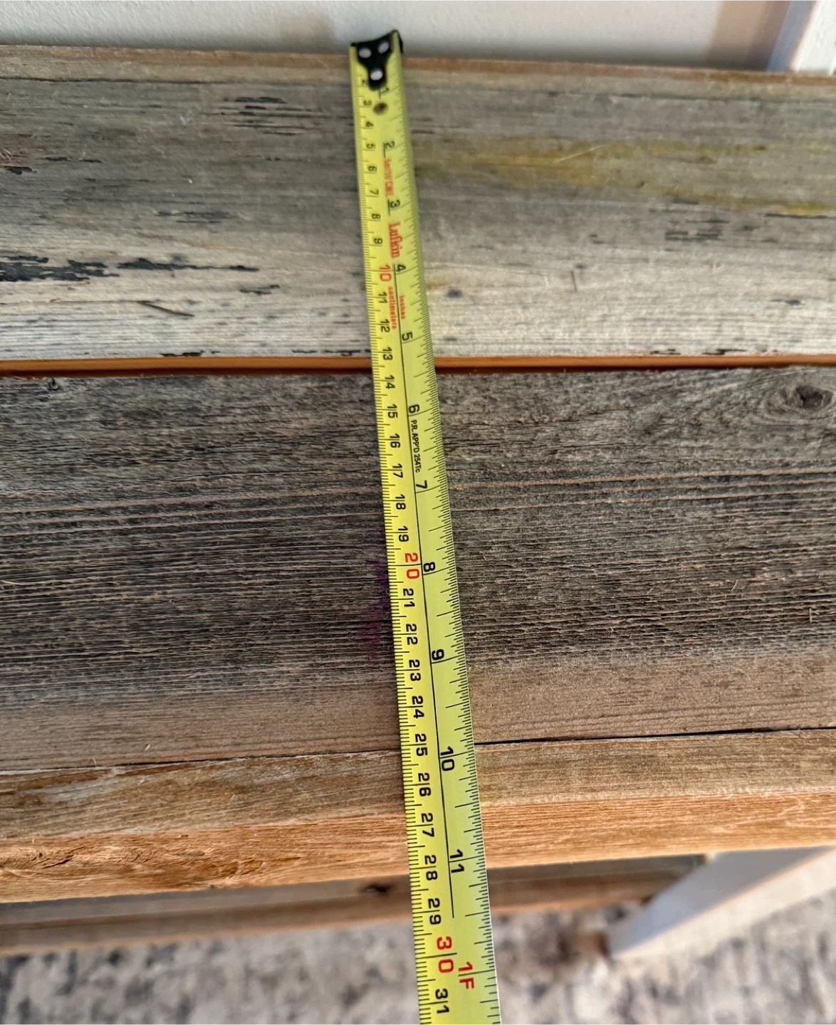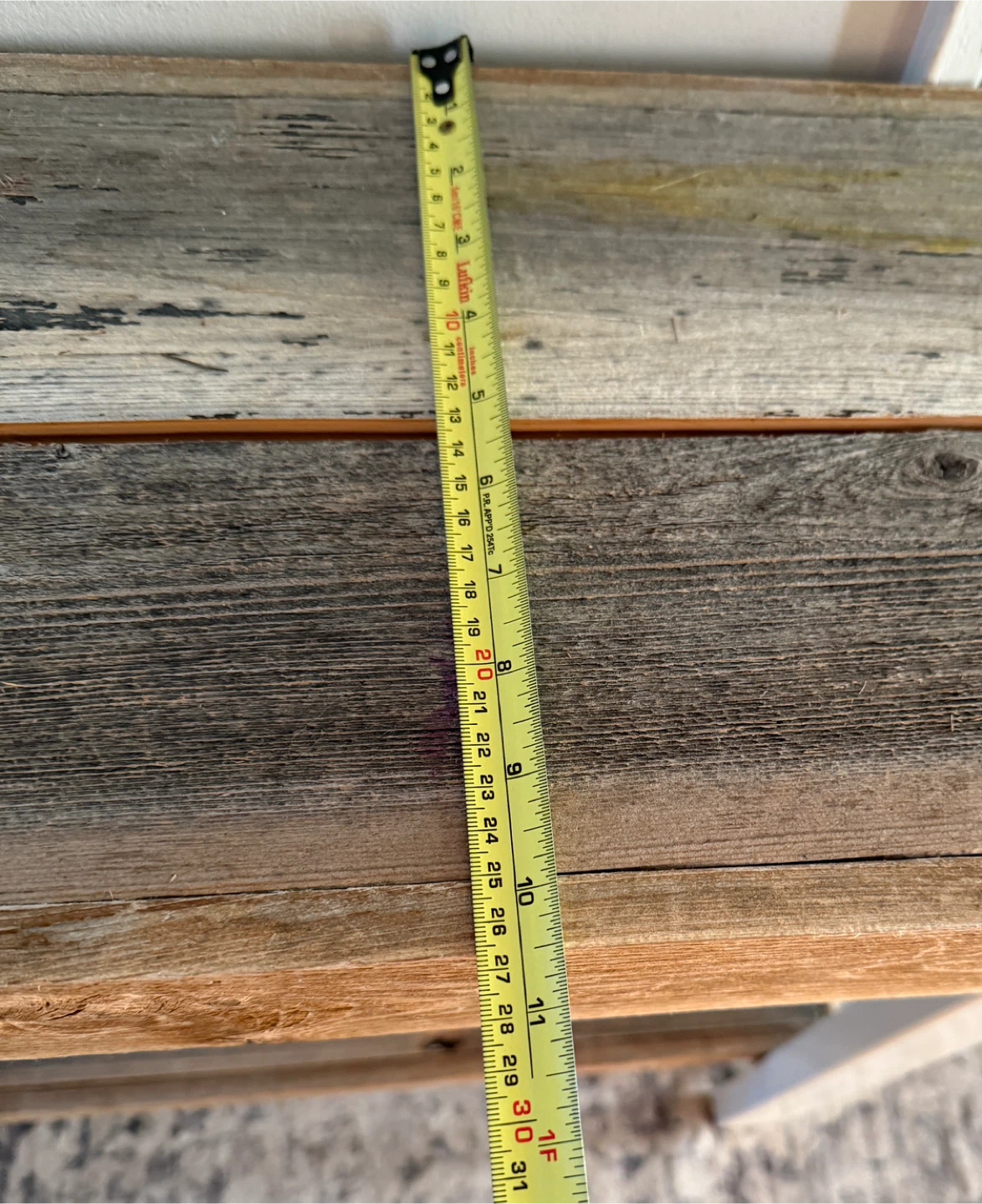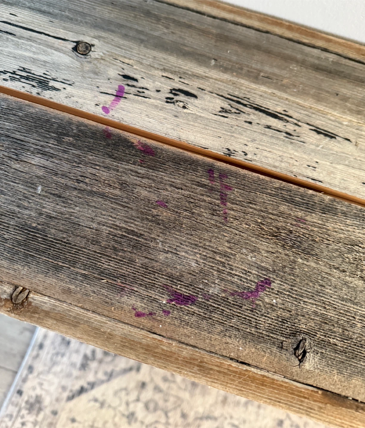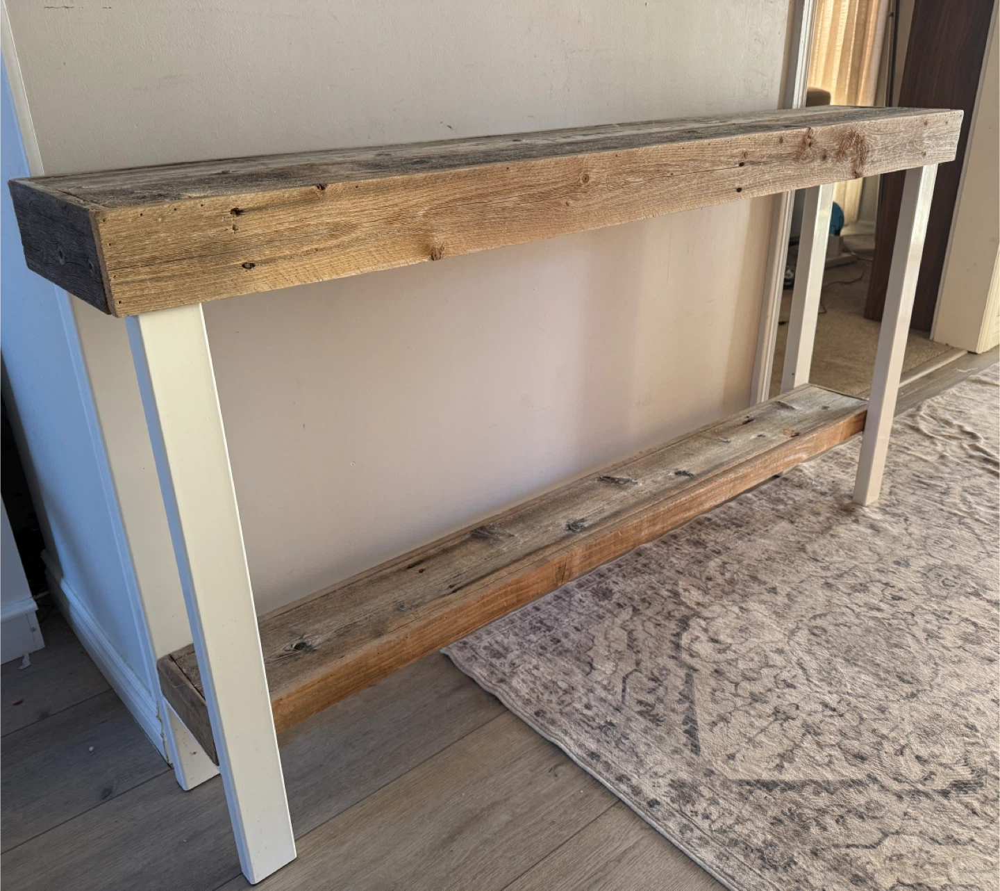 Selling a rustic wood console table! It's approximately 59 inches long, 32 inches tall, and 11 inches wide. Reclaimed wood top with metal legs. Please note marks on last photo. It’s washable marker and will most likely come off with some light sanding. It would be a great addition to any home!