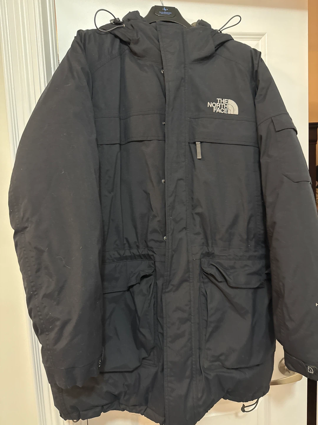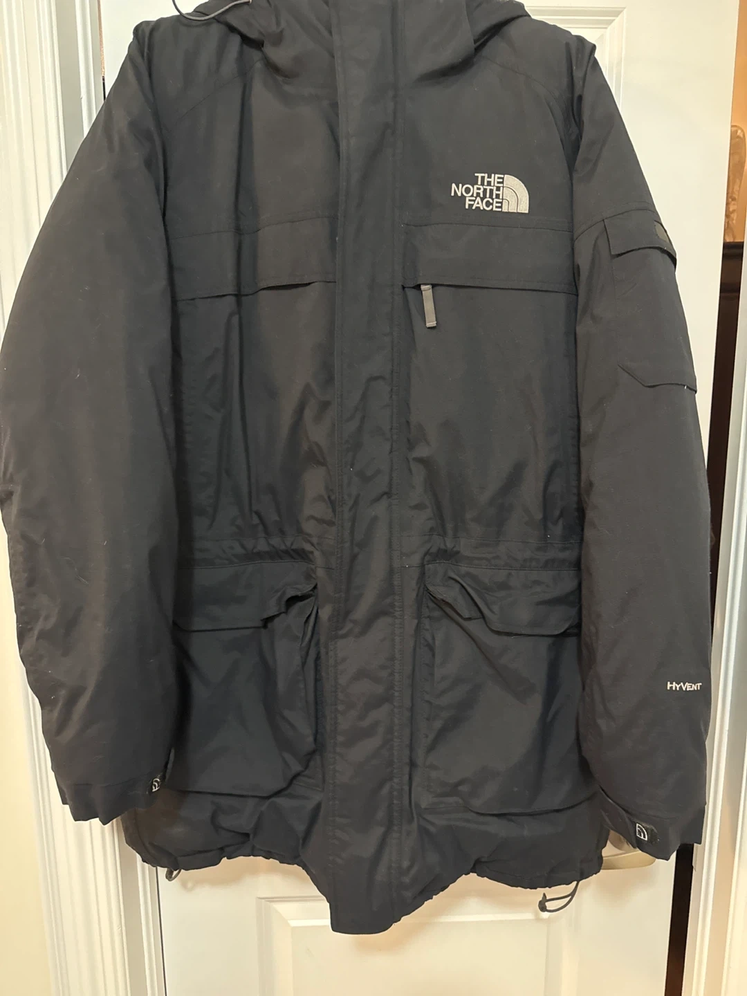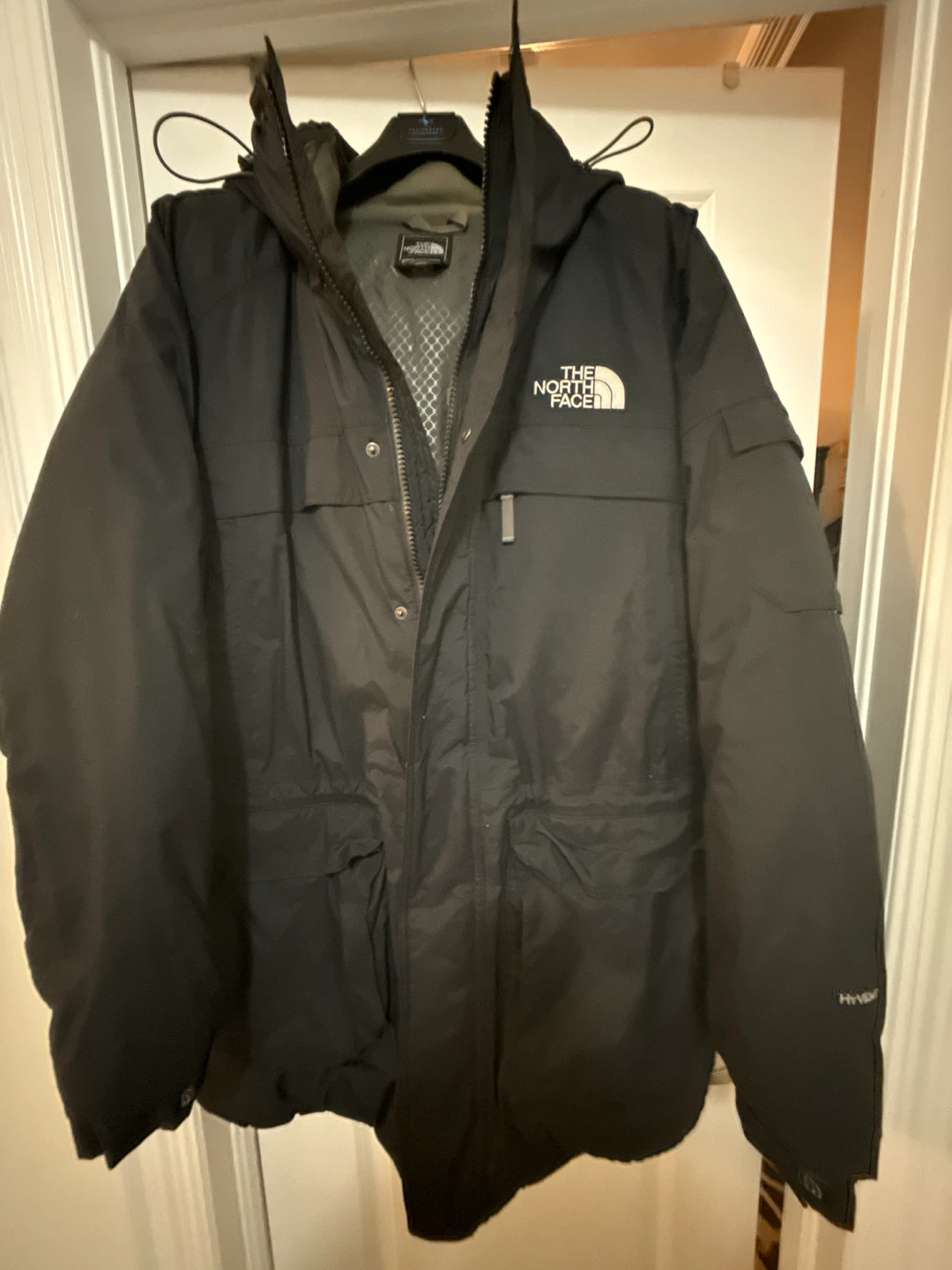 Here's a The North Face men's winter down filled hyvent jacket in size XL. It's black and ready to keep you VERY warm this winter!
